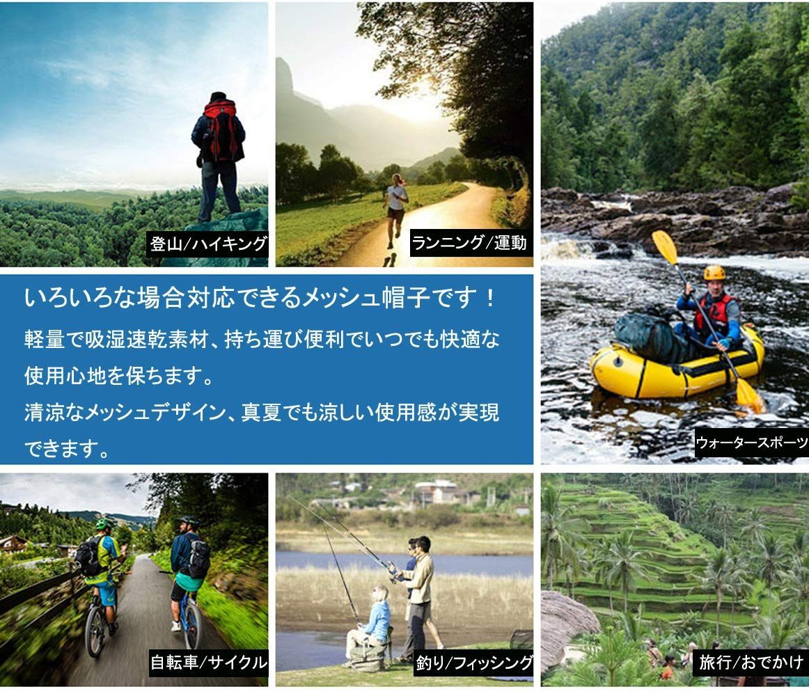 ご覧いただきありがとうございます。 当店では他サイトにも商品を販売しているため まれに売り切れや取り寄せ中となる場合があります。 また、お客様都合でのキャンセル依頼はお受けできかねます。 ご購入頂きましたら発送システムがスタート致しますので、ご了承頂き、購入手続きの方をお願いいたします。 基本的にはスピード配送になりますが、商品によっては、お時間を要するものもありますので、その際はご購入後にお知らせさせて頂いております。よろしくお願いいたします。 帽子 メンズ uvカット メッシュキャップ 通気速乾 夏帽子 ワークキャップ uv つば付き帽子 男性 日よけ帽子 かっこいい 無地 紳士用帽子 釣り ランニング 登山 海 旅行 お出かけ アウトドア 日焼け止め防止 紫外線対策 スポーツキャップ 父の日 プレゼント 【夏帽子】薄い生地を使用しているメンズキャップ、軽量で長時間使用しても負担になりません。つば広デザイン、影をしっかり作られて日差しから顔をガードします。夏のUVカット帽子、日焼け止め対策としてオススメです。眩しい光線をカットして、運動や移動中もっと安心です。 【通気速乾】後ろは六角形メッシュ素材に切り替えデザイン、通気性がよくてかいた汗迅速に蒸発でき、夏でもムレにくいし、涼しい被り心地が実現できます。速乾なので、水や雨で少し濡れても大丈夫、ボート、漂流、マリンスポーツ場合にも対応できます。 【サイズ調節可能】後ろのバックルを通して帽子のサイズが調節でき、フィット感を高めます。調節用のベルトを収める穴も付いているから、人にスマートなイメージに与えます。裏側には汗止めテープがつき、汗が目には入れないから、サラッとした使用感を維持します。 【おしゃれ】シンプルで飽きこないデザイン、無地なカラー、誰でもおしゃれにかぶれるワークキャップです。カジュアルスタイルにも、スポーティースタイルにもよくハマるし、コーディネートしやすいです。メンズ中で人気している色、年齢を問わず幅広い方にご愛用されています。 【多用途】夏用日よけ帽子としてはもちろん、ゴルフ、登山、ランニング、釣り、自転車、テニス、ジョギング、様々な場合にも対応できるスポーツキャップとしてもご利用いただけます。 サイズ:頭周り58㎝  深さ9㎝  つば6.5㎝ 最後までご確認頂き誠にありがとうございました。 上記をご確認頂き、ご購入いただけましたら幸いです。 何かご不明な点がございましたらお気軽にメッセージからお問い合わせ下さい。