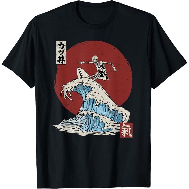 送料無料 100%コットン スケルトン サーフィン 神奈川沖浪裏 デザイン Tシャツ 赤い太陽 日本風 熱転写3Dプリント メンズ レディース おもしろい 半袖 パロディ Tシャツ