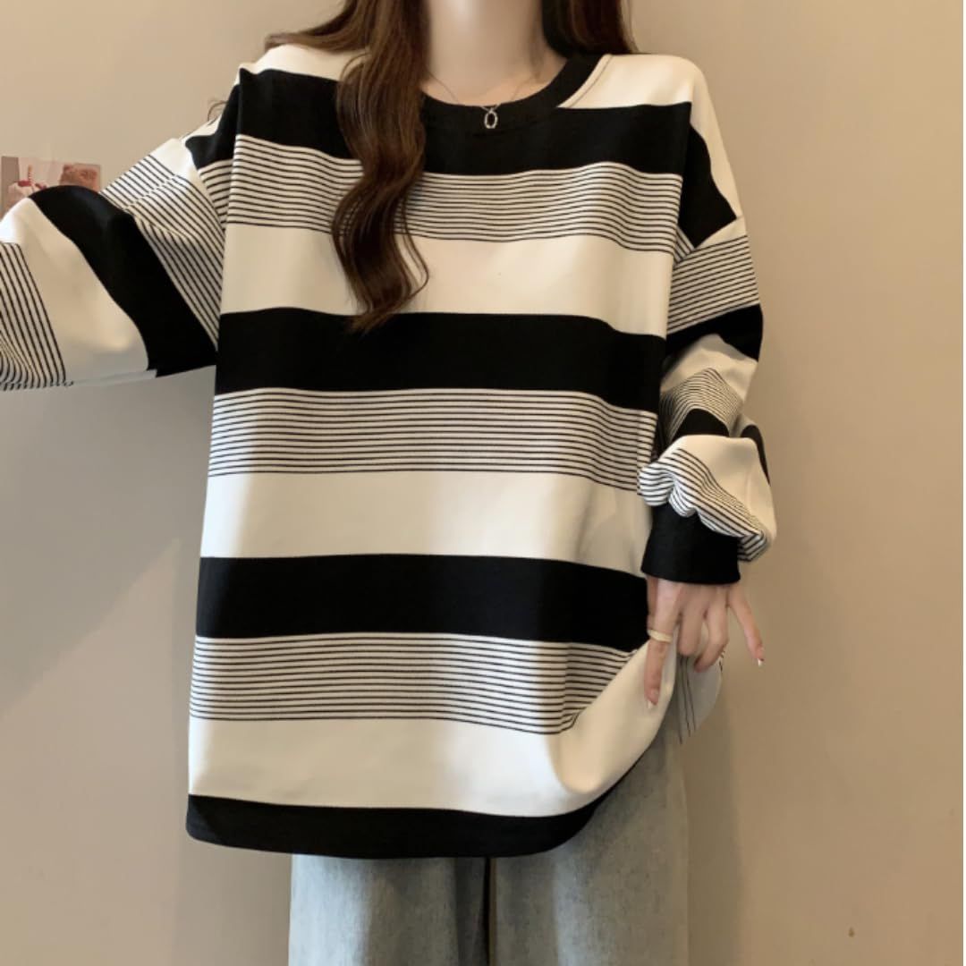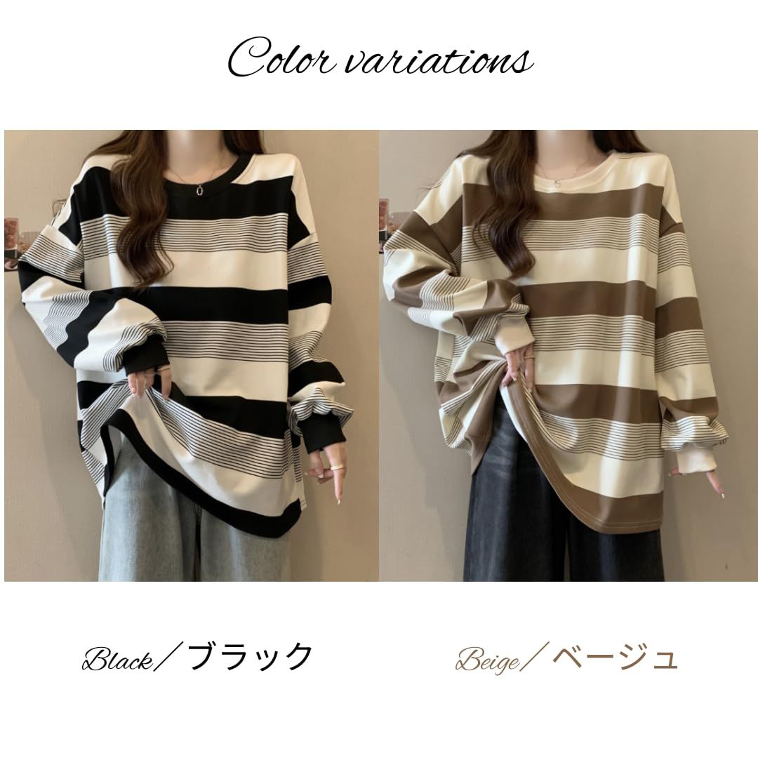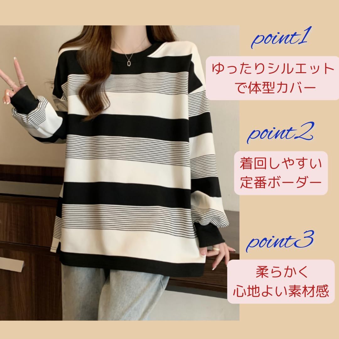 ーーーーーーーーーーーーーーーーーーーーーーーー ☆送料無料☆ ☆即購入大歓迎です!☆ こちらの商品の他のカラー・サイズなど他の種類もそろえています! よろしければ下記のワードで検索してみてくださいね♪ ↓↓↓↓ nJwYFTqjNg で検索 ーーーーーーーーーーーーーーーーーーーーーーーー ✅【ゆったりシルエットで体型カバー】 自然に身体のラインを拾いすぎないオーバーサイズデザイン。気になる部分をさりげなくカバーし、リラックス感のある着こなしが叶います。✅【着回しやすい定番ボーダー】 ベーシックで使いやすいボーダー柄を採用。デニムやスカート、ワイドパンツなど幅広いアイテムと相性抜群で、デイリーコーデにぴったりです。✅【柔らかく心地よい素材感】 肌触りの良い生地を使用し、長時間の着用でも快適。軽やかな着心地で、春・秋・冬とロングシーズン活躍します。韓国風おしゃれデザイン。ゆるっと着られるトレンドの韓国ファッションテイスト。シンプルだけど洗練された1枚で、コーデをおしゃれに仕上げます。✅【選べる2色展開(ブラック / ベージュ)】 ベーシックで合わせやすい2カラー展開。どちらもナチュラルで大人可愛い雰囲気があり、色違い購入にもおすすめです。✅【サイズ】  【M】 着丈69cm/バスト120cm/袖丈51cm、【L】 着丈70cm/バスト124cm/袖丈52cm、【XL】 着丈71cm/バスト128cm/袖丈53cm ※寸法は平置きにして計測しており、若干の誤差がある場合がございます。 トレンドのゆったりシルエットが魅力の長袖ボーダーカットソーです。 着るだけでこなれ感が生まれるオーバーサイズデザインで、ほどよいルーズさが大人のカジュアルスタイルを演出。柔らかい生地感で肌あたりが良く、デイリー使いに最適な1枚です。 定番のボーダー柄は季節を問わず活躍し、デニムやスラックス、スカートなど、どんなボトムスにも合わせやすい万能アイテム。ゆるトップス × 細身パンツのメリハリコーデも、ワイドパンツと合わせたリラックスコーデも思いのまま。 カラーは使いやすいブラックと、柔らかい印象のベージュをご用意。カジュアルから綺麗めまで幅広く対応でき、ワードローブに1枚あると便利なマルチトップスです。