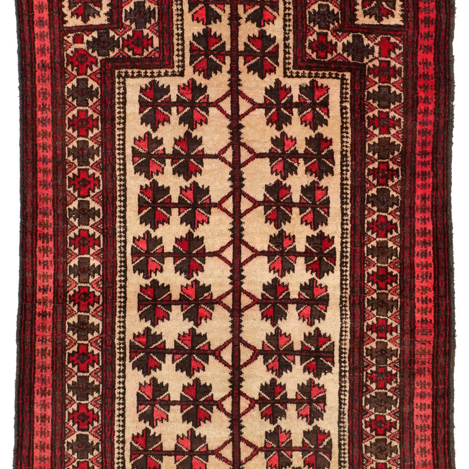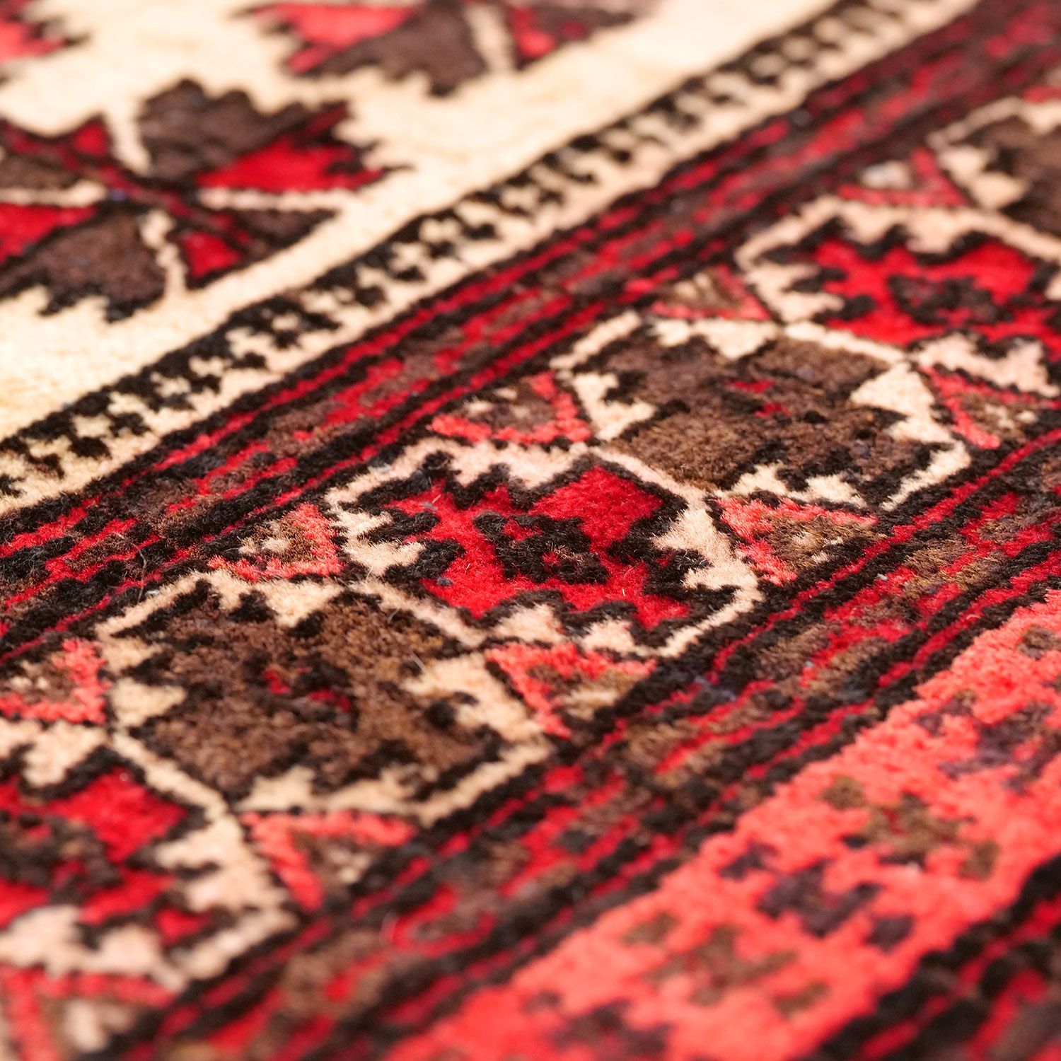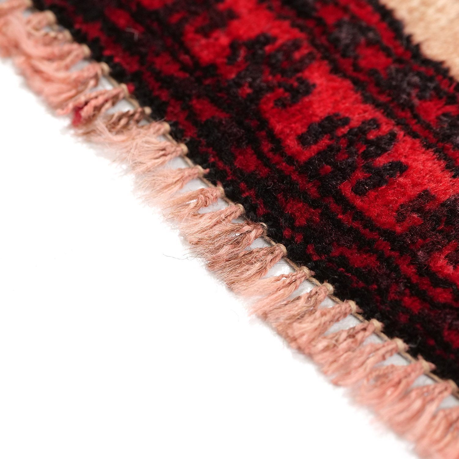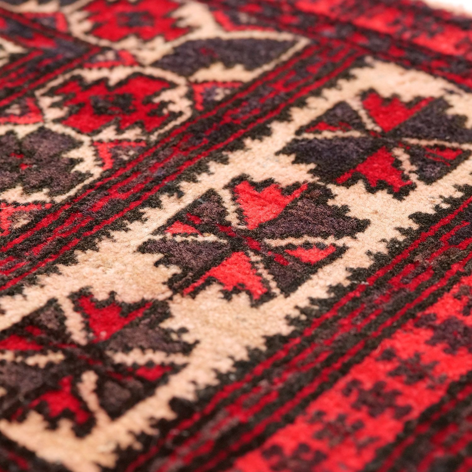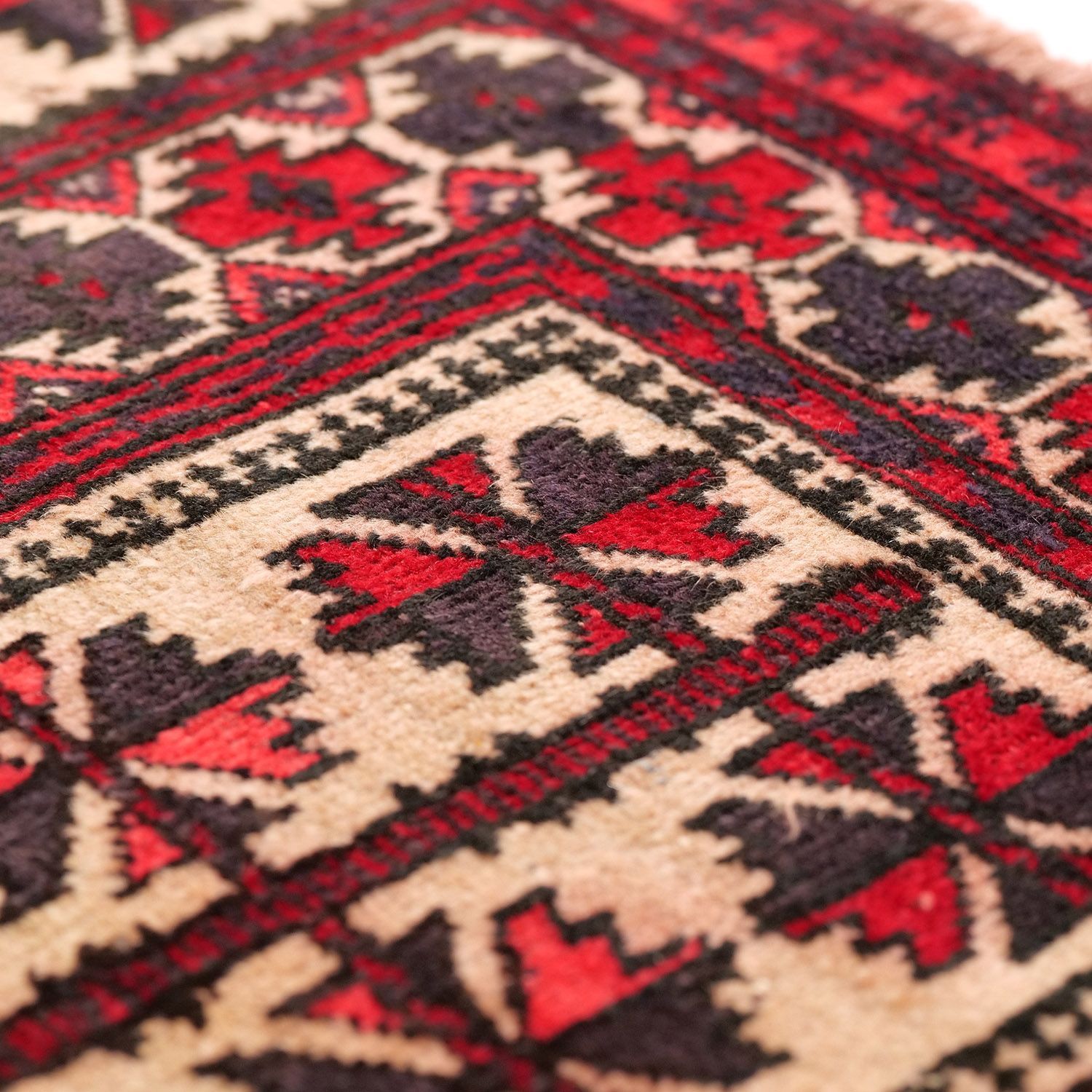 生成りのフィールドに赤と黒のコントラストが映え、素朴ながらも荘厳な印象を与えます。ベースの生成り色は経年により柔らかなクリーム色へと変化しており、深みと温かみを増しています。トルバトジャム特有の細やかなボーダー文様が全体を引き締め、手仕事ならではの力強い美しさを感じさせます。