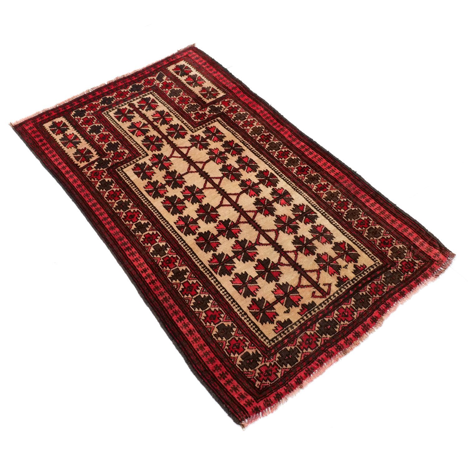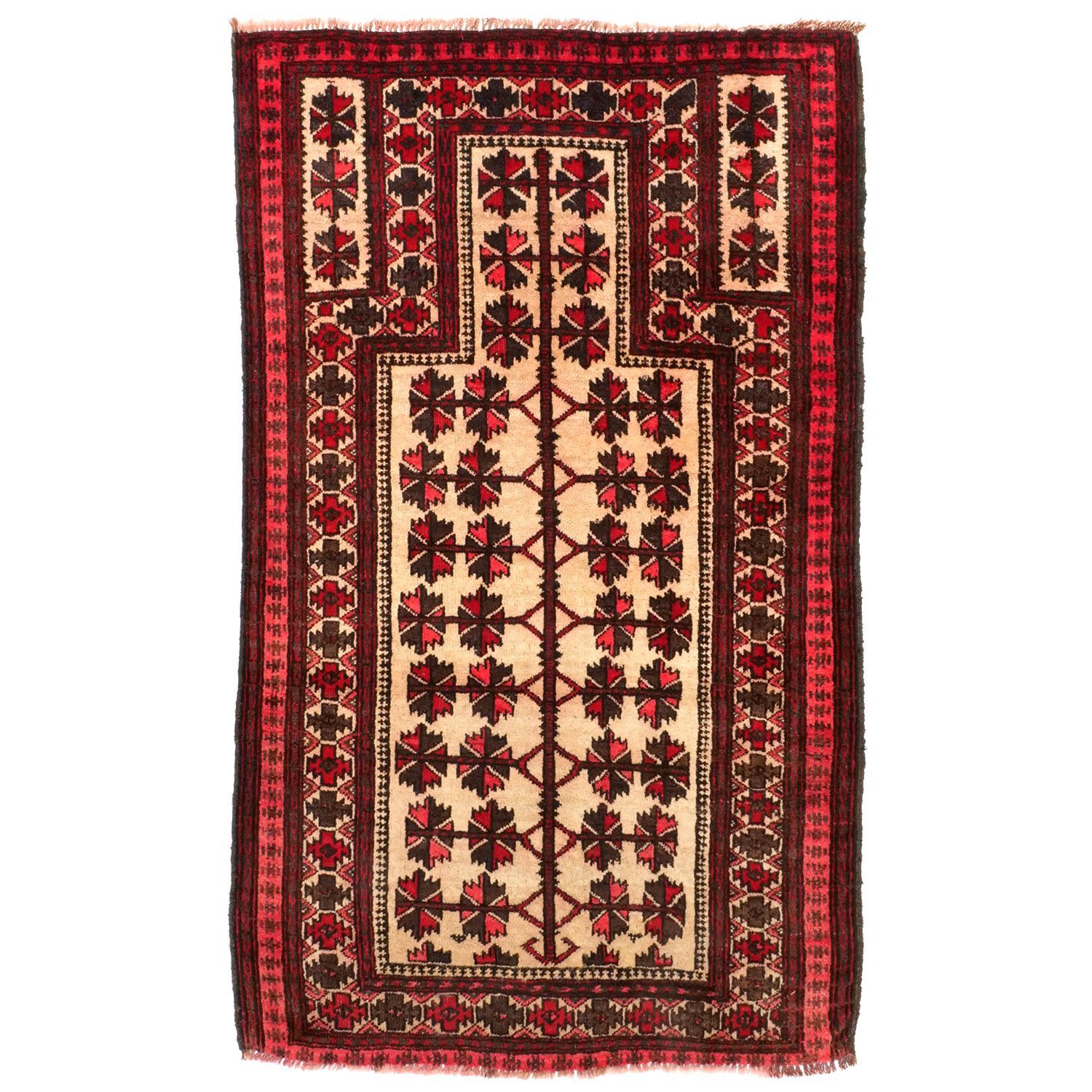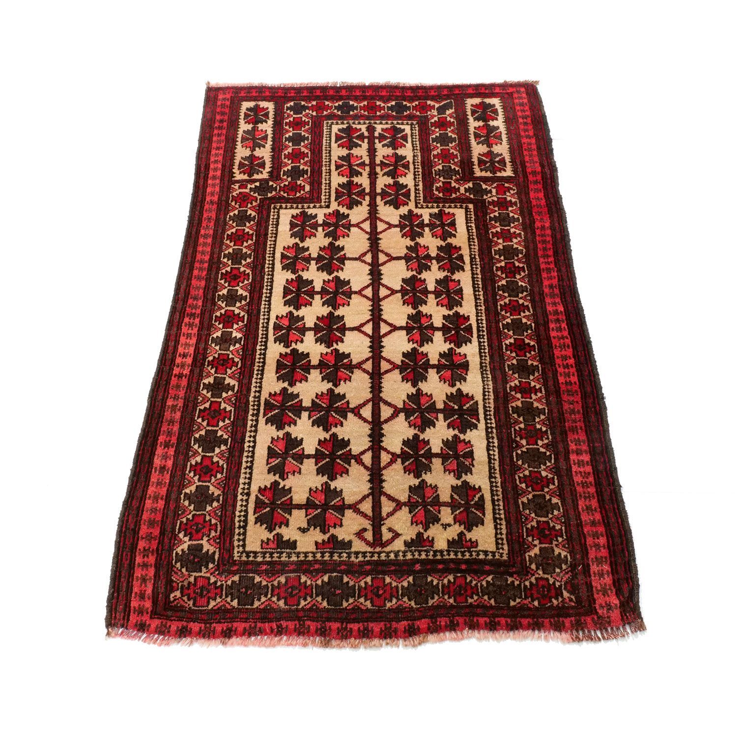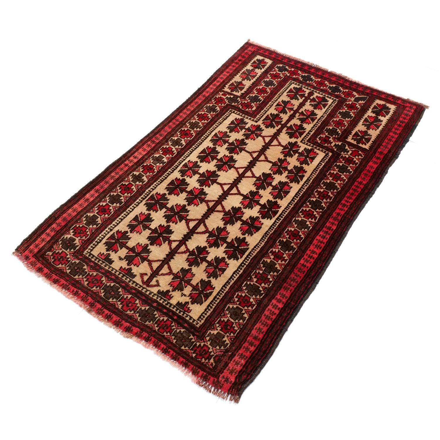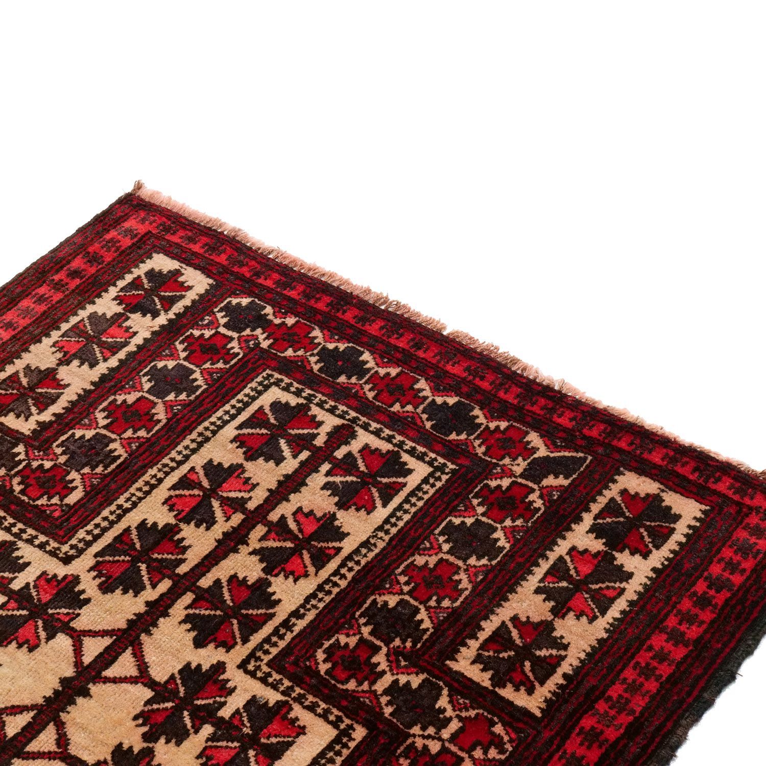 生成りのフィールドに赤と黒のコントラストが映え、素朴ながらも荘厳な印象を与えます。ベースの生成り色は経年により柔らかなクリーム色へと変化しており、深みと温かみを増しています。トルバトジャム特有の細やかなボーダー文様が全体を引き締め、手仕事ならではの力強い美しさを感じさせます。