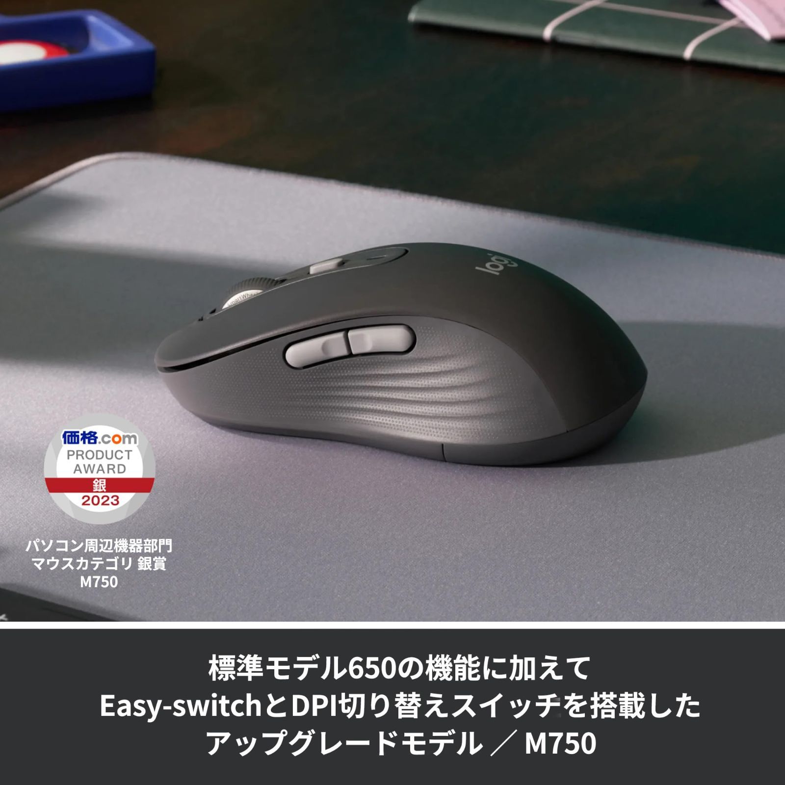 M750/標準モデルSignature M650の機能に加えて3台までの接続デバイスをボタンのみで切り替えられるEasy-switchとカーソル速度が調整可能なDPI切り替えスイッチを搭載したアップグレードモデル