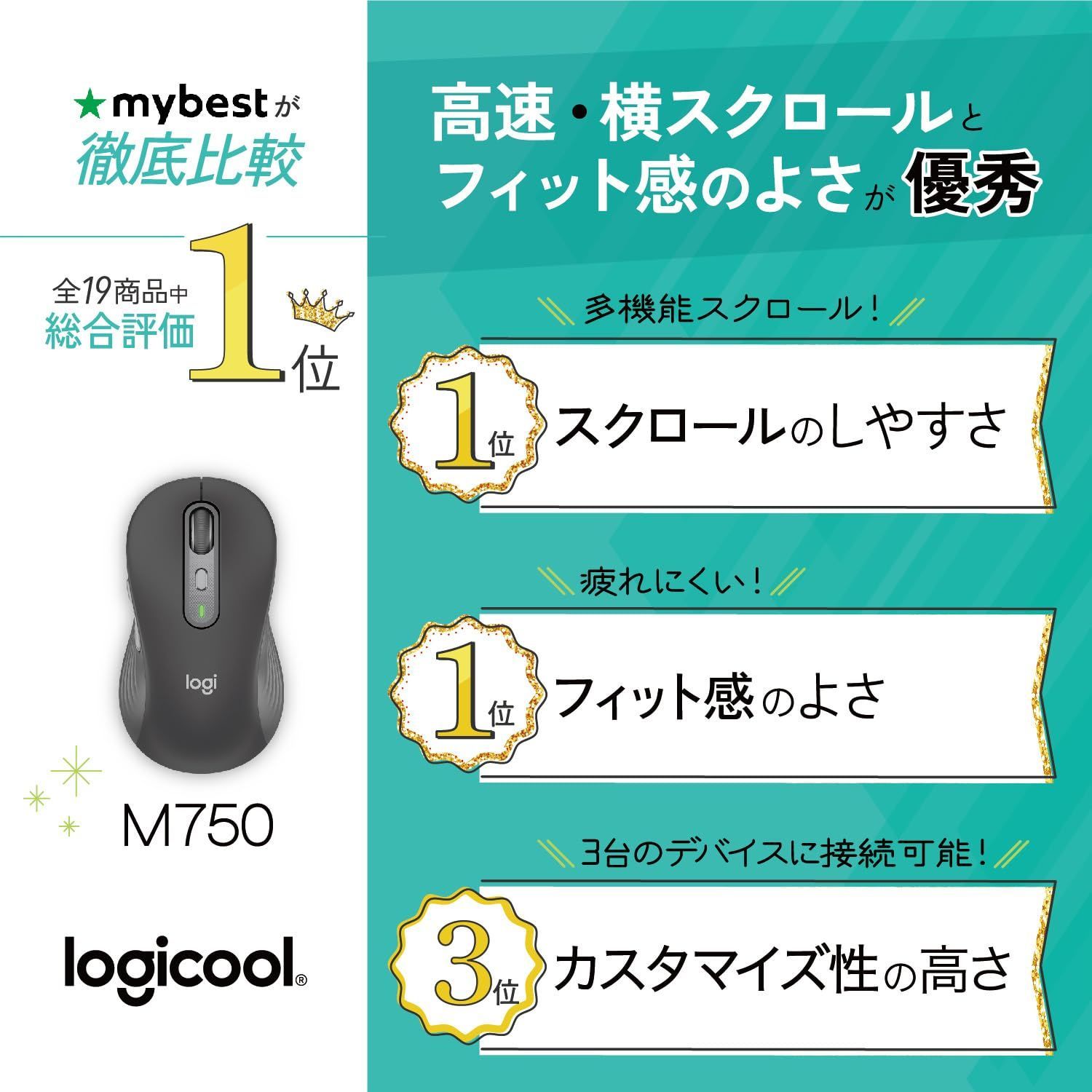 Signature M750/レギュラーサイズ/勢いよく回すと高速スクロールに自動で切り替わる/独自のSmartWheelを搭載したフィット感抜群の静音ワイヤレスマウス