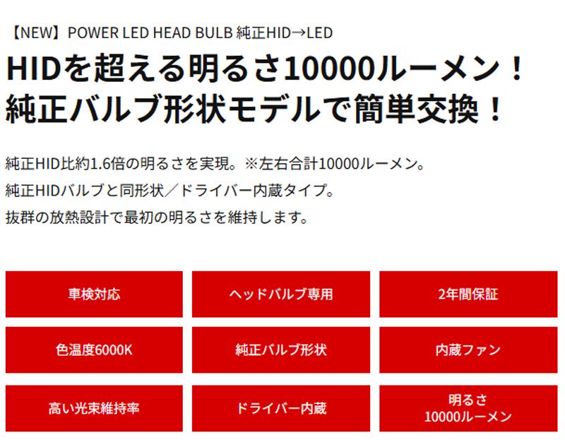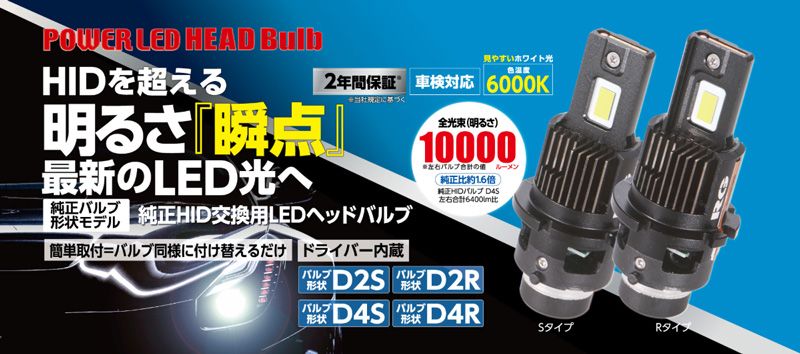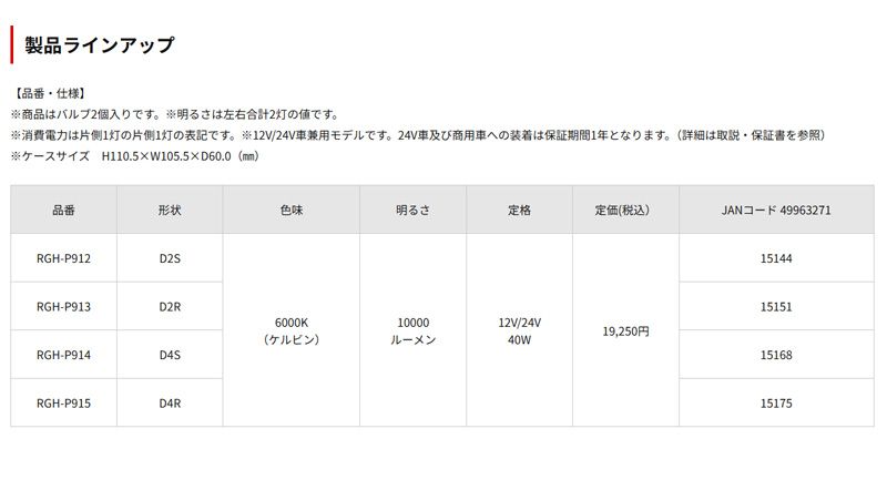 RGレーシングギアRGH-P915純正HID交換用LEDヘッドバルブ/形状D4R/色味6000K(ホワイト)/明るさ10000lm/12V・24V車検対応