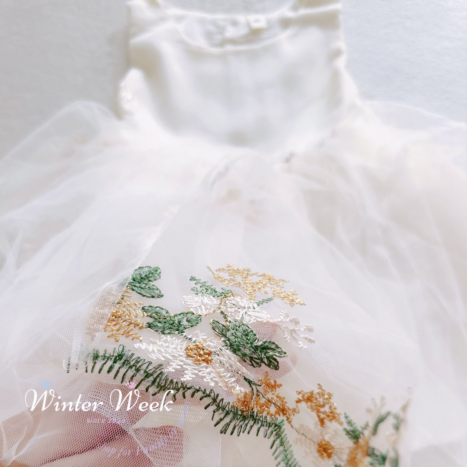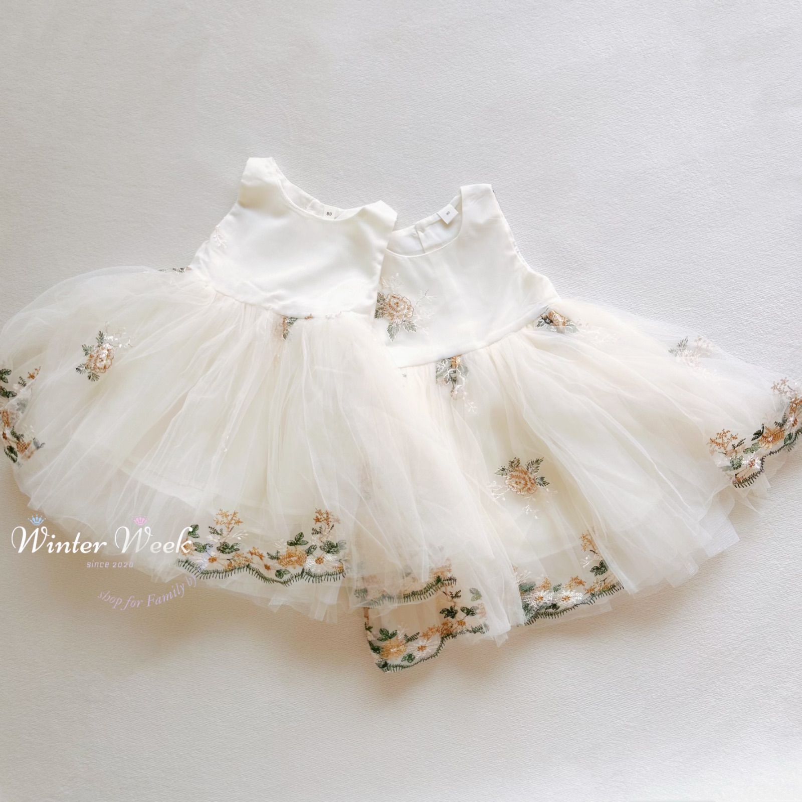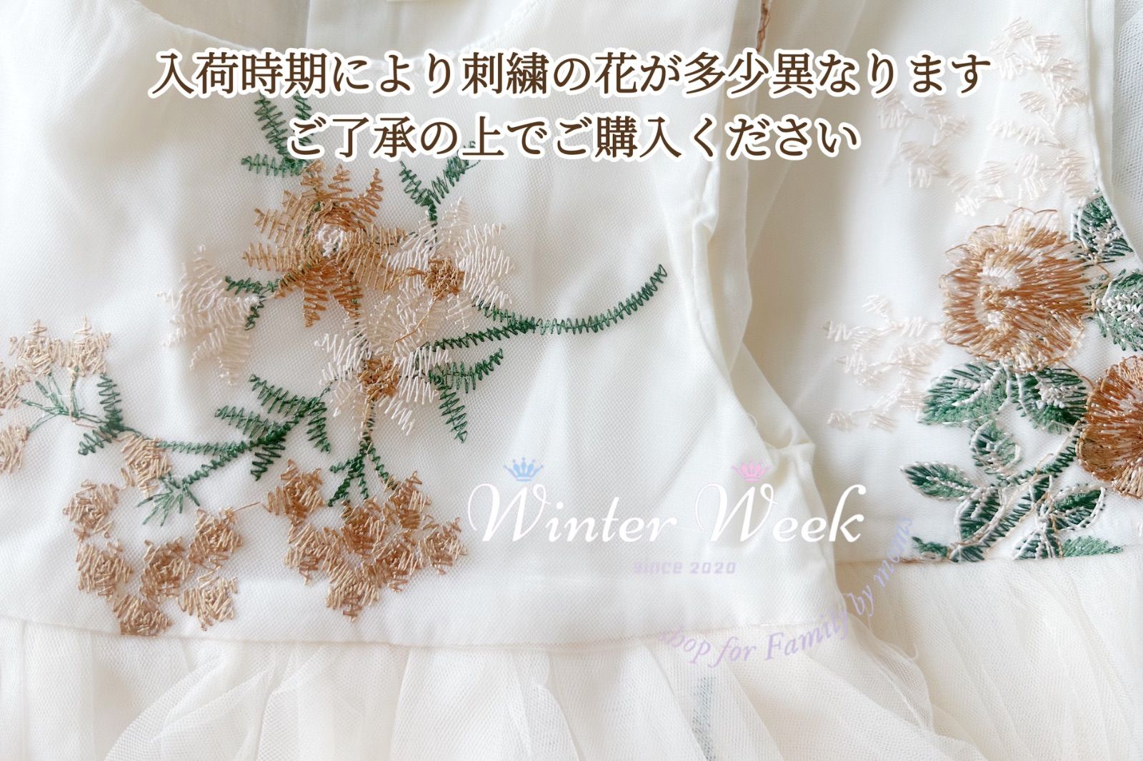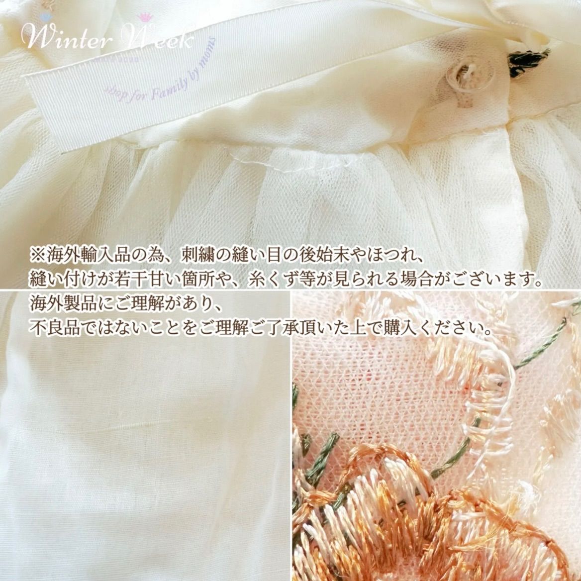 優しい色合いと美しい花柄刺繍が特徴で、動くとチュールが揺れて子どもの可愛らしさを引き立てるデザインとなっています。