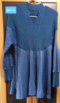 青 長袖チュニック「ケーブル編み」「プリーツ切り替え」「ティールブルー」