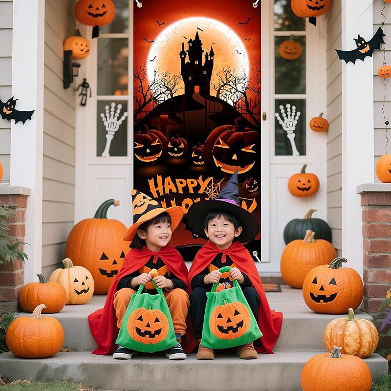 ハロウィンの雰囲気を一気に高めてくれるタペストリーです。軽くて扱いやすい布製なので、壁やカーテンに貼り付けたり、天井に吊るしたり、ワゴンや陳列棚に吊るせば簡単にハロウィン装飾になります。子どものフォトスポットにも最適です。