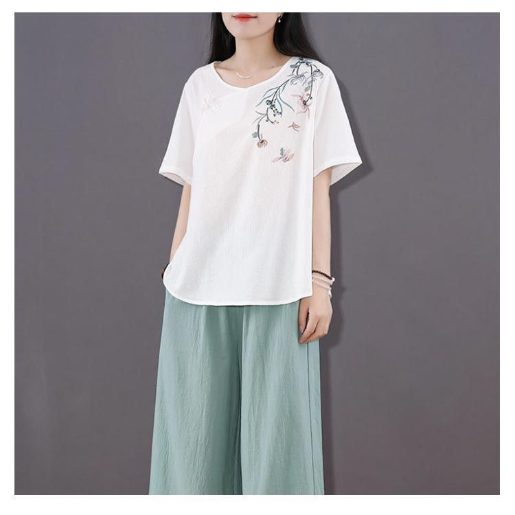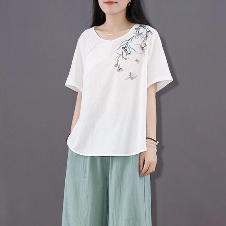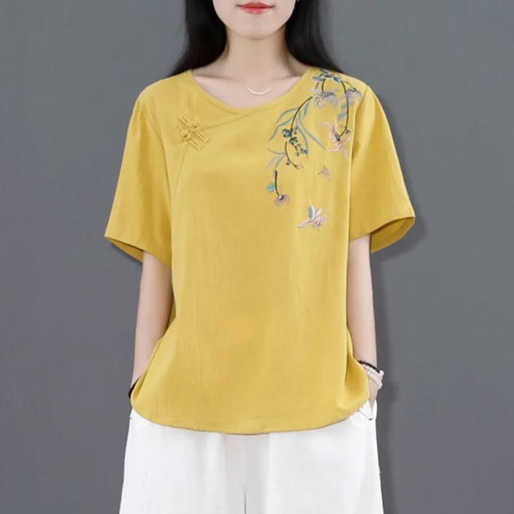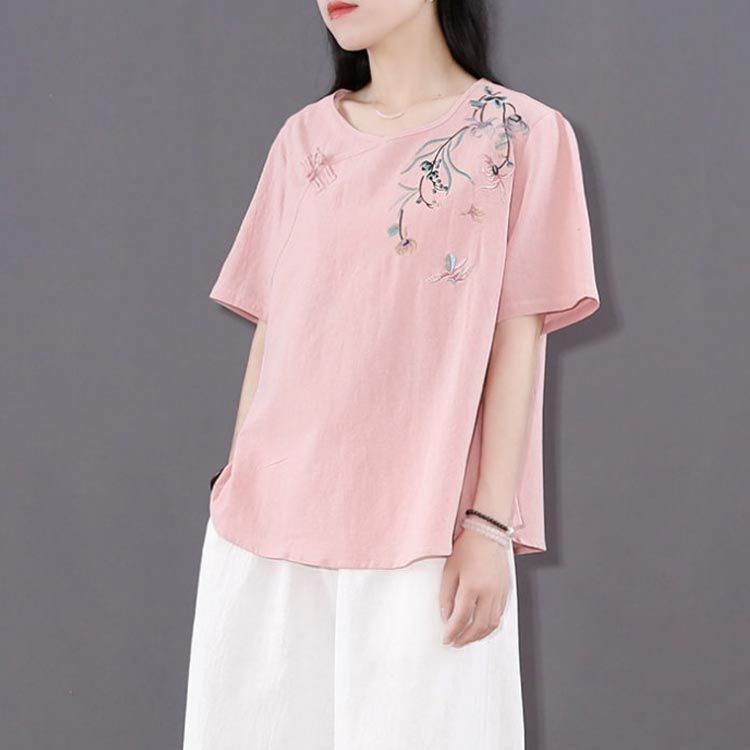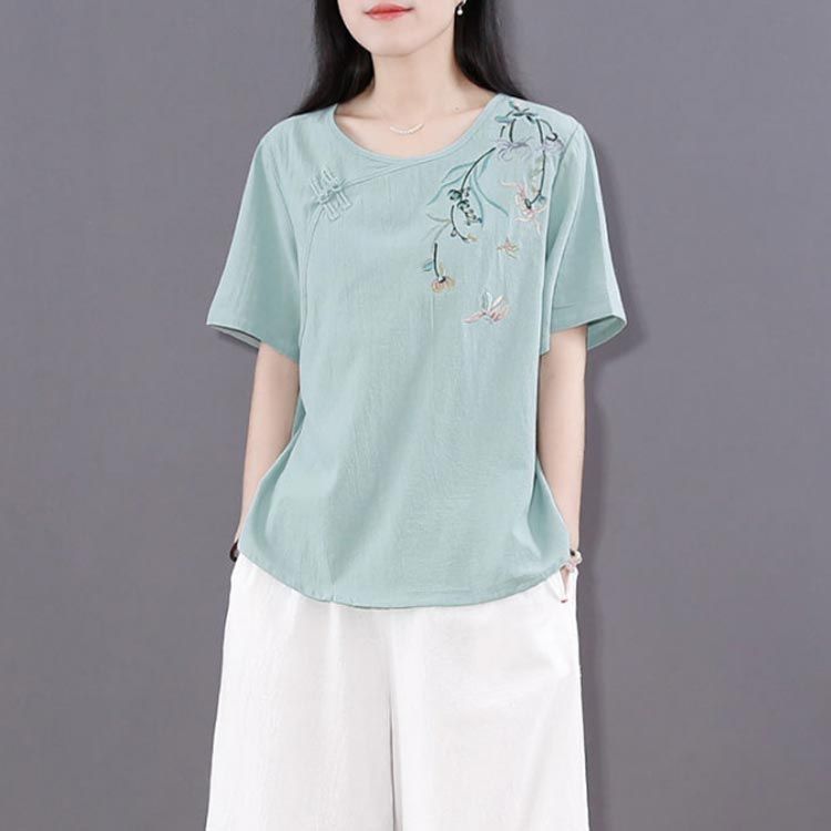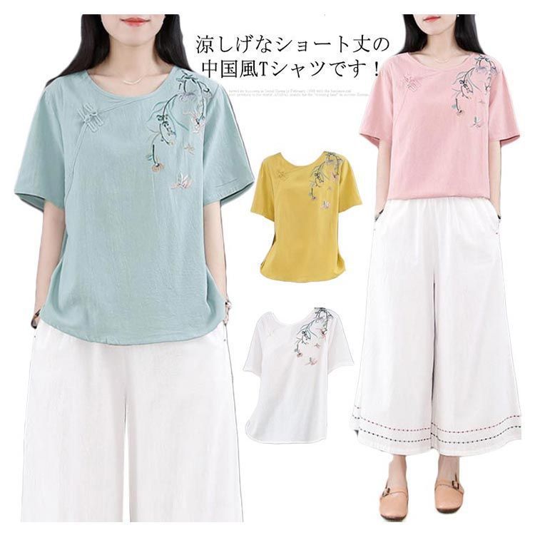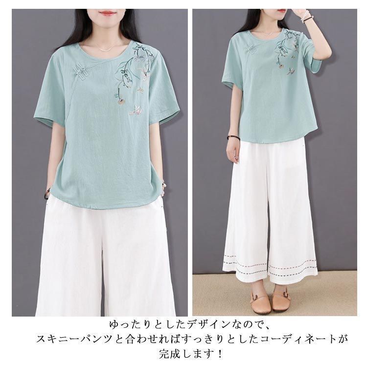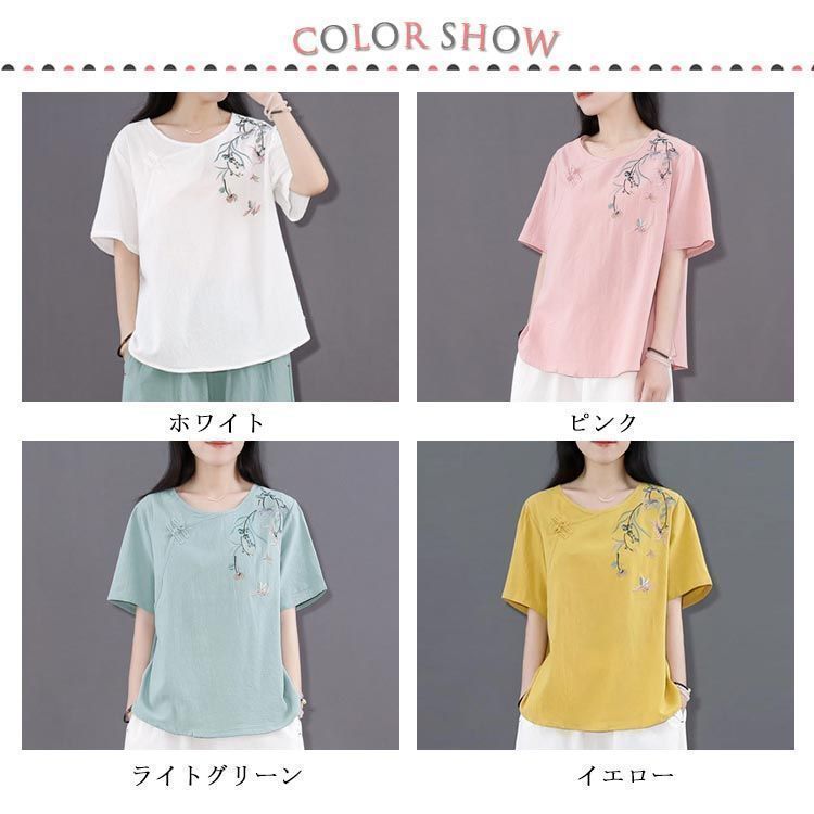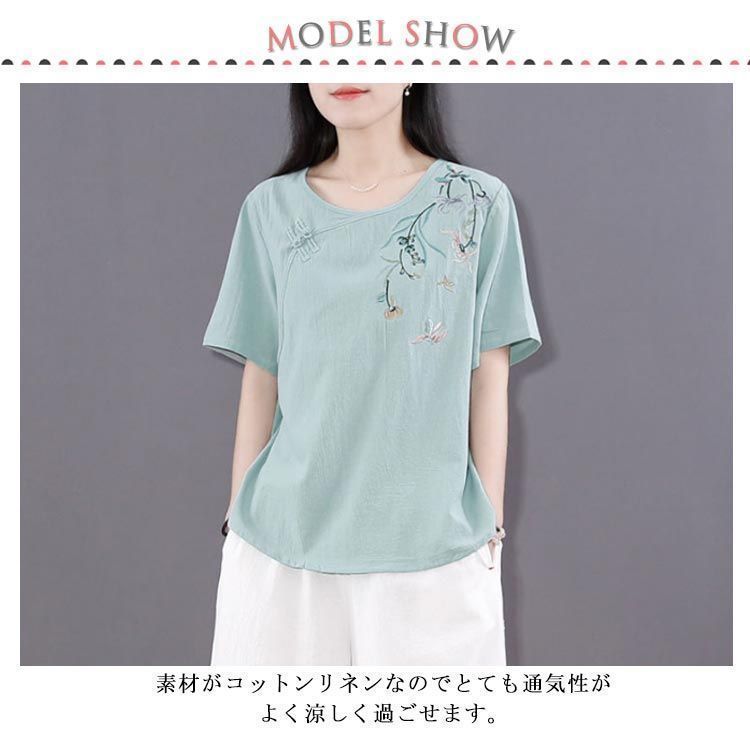 新品 綿麻 トップス 体型カバー カットソー プルオーバー Tシャツ チャイナ風 夏 薄型 刺? 無地 半袖Tシャツ レディース ゆったり 大きいサ