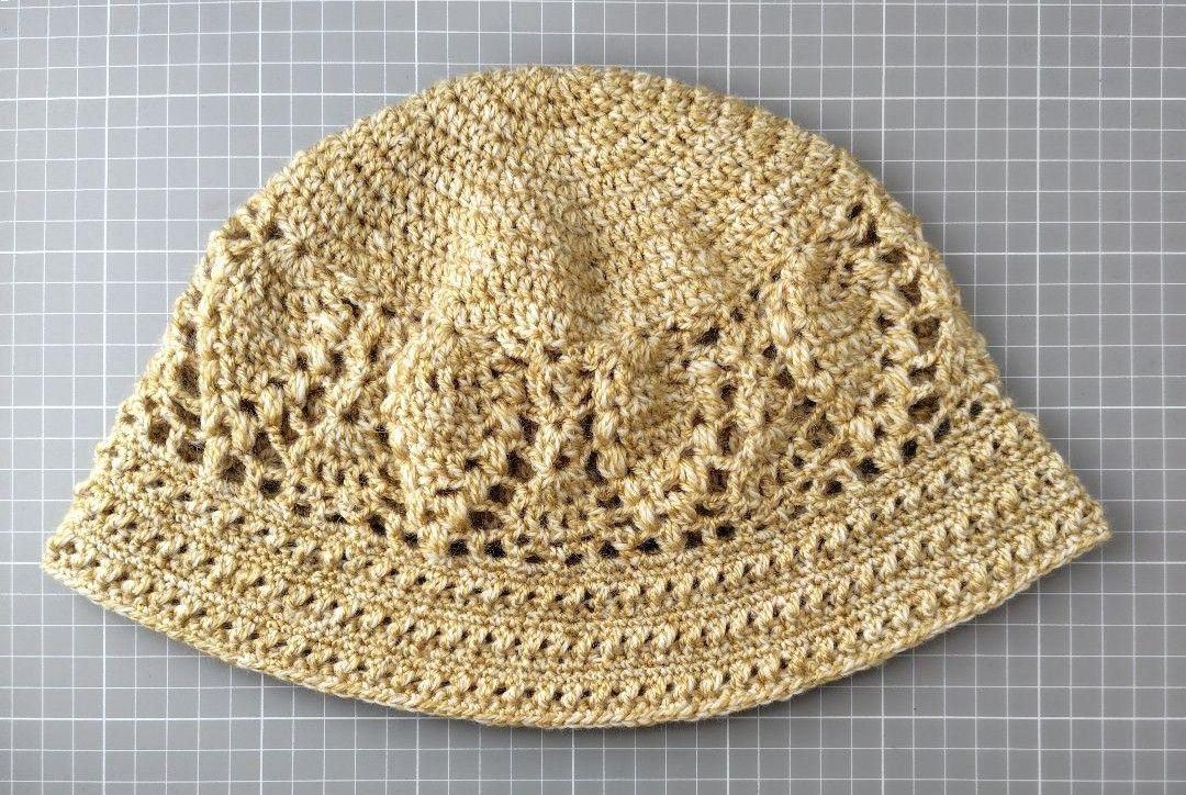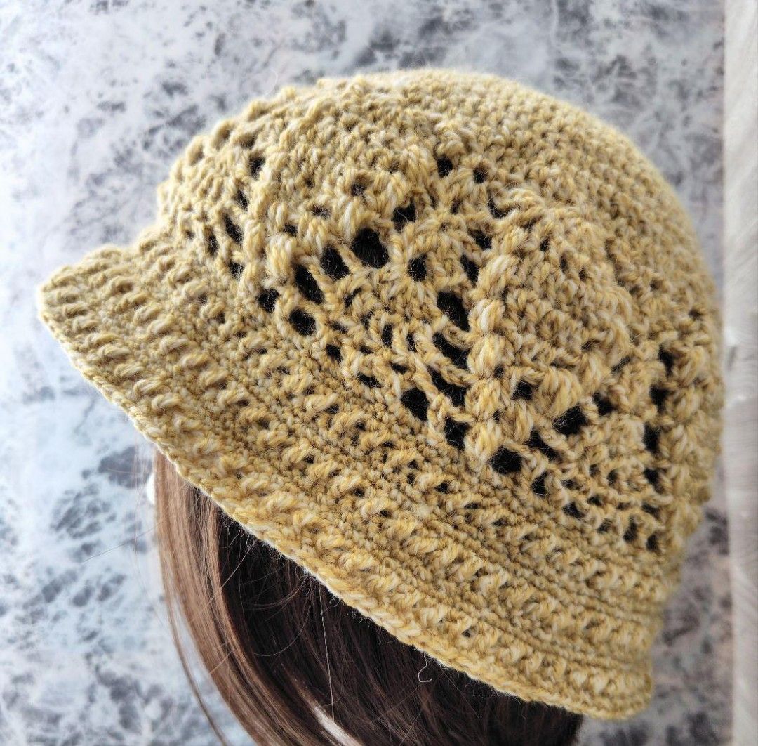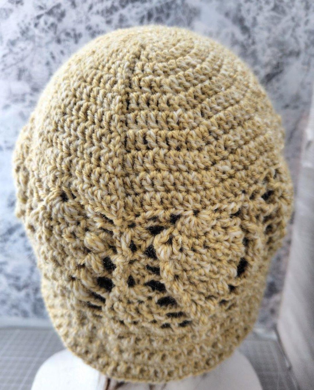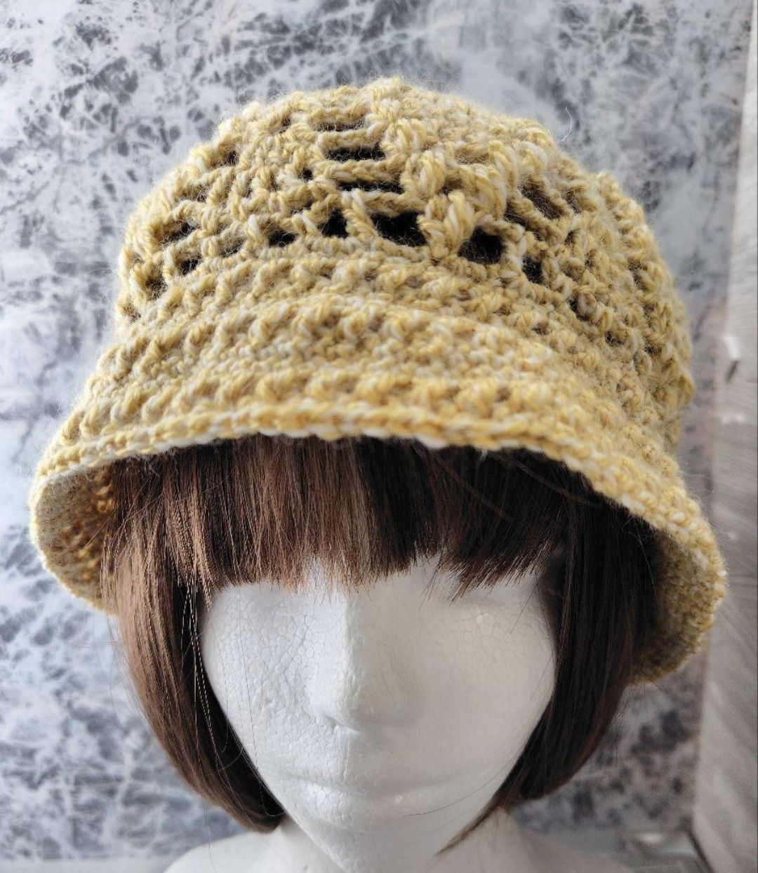 秋冬 クロシェハット クラッシャーハット 生成り、薄辛子混ざり ウール混アクリル パイン編み 透かし編み かぎ針編み ニット帽