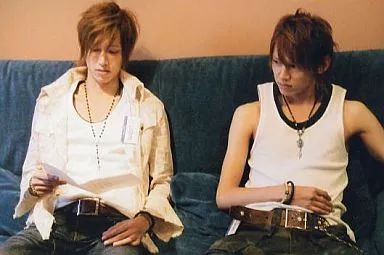 【中古】生写真(男性) ON/OFF/集合(2人)/横型・膝上・ベージュ色シャツ・白のタンクトップ・右手紙・ジーンズ・右手お腹・青色のソファ・ネックレス・ポストカードサイズ/公式生写真