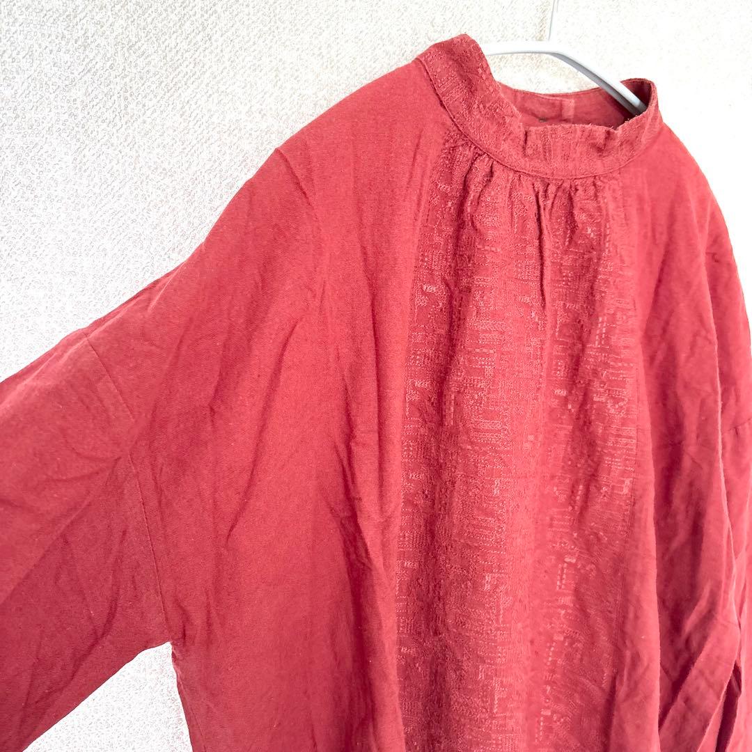 美品✦SUN VALLEY 刺繍シャツブラウス M 赤レッド 綿麻 ハイネック