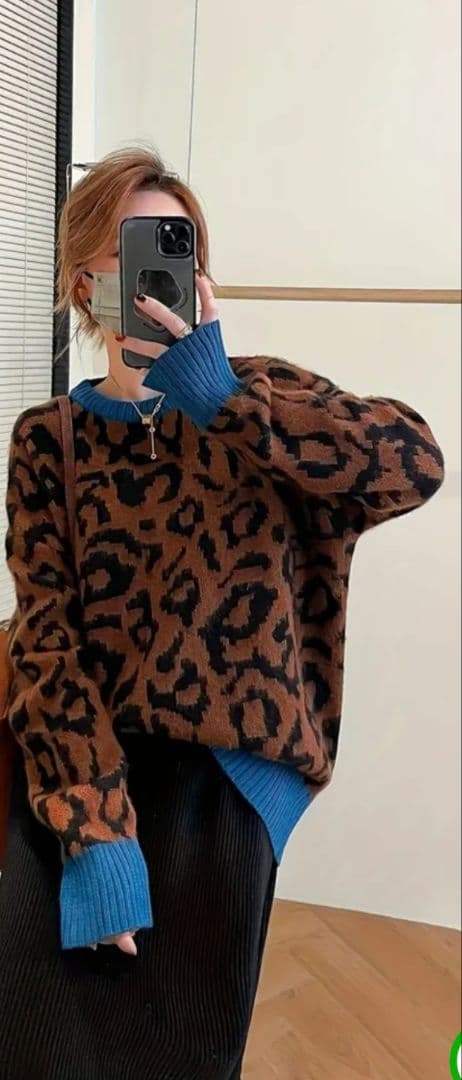 ヒョウ柄ニットセーター ブラウン/ブルー