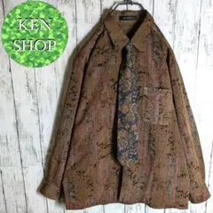 ネクタイシャツ ダークブラウン デザイン総柄 ボタニカル柄 ヴィンテージ古着