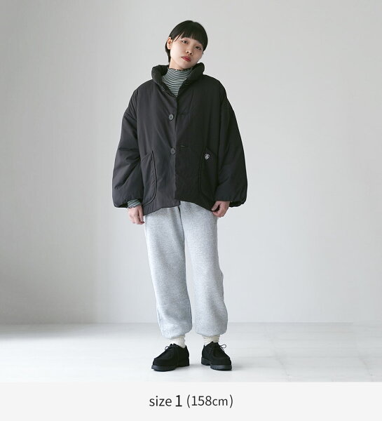 サイズ1だとヒップの3分の2が隠れるぐらいの長さでしたが、袖が手首にかかるぐらいの丈感で、アウターにしては少し短いかな?と感じました。サイズ2だともう少し覆われる感覚があるので安心です。身幅のゆったり感はどちらのサイズでもしっかり堪能できました。