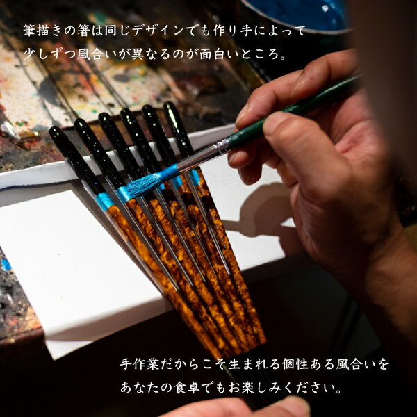 筆描きの箸は同じデザインでも作り手によって少しずつ風合いが異なるのが面白いところ。手作業だからこそ生まれる個性ある風合いをあなたの食卓でもお楽しみください。