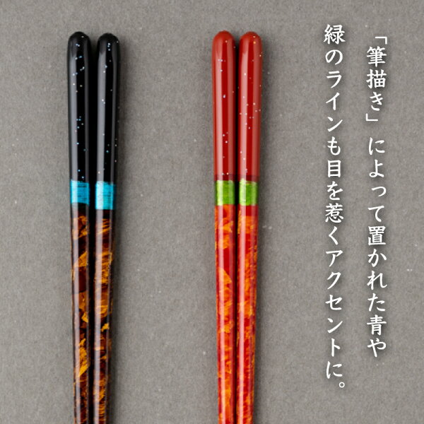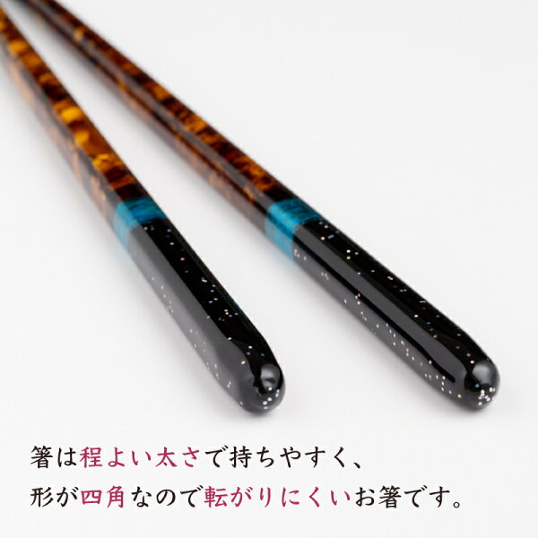 職人が一膳づつ丹精を込めて筆で絵付けした、食器洗浄機対応のお箸「夜空」。持ち手に散らされたラメとアクセントの青のラインがハッとする美しさを醸し出しています。