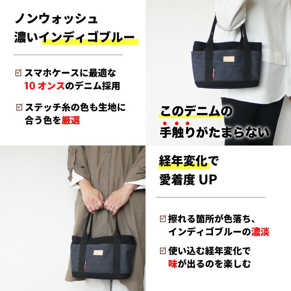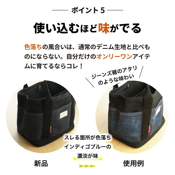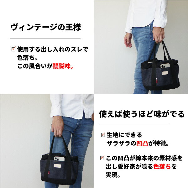 ・厚手で丈夫なキャンバス時をベースに周りを使い込むと風合いが増すデニムで仕上げてよくあるバッグと差をつける。