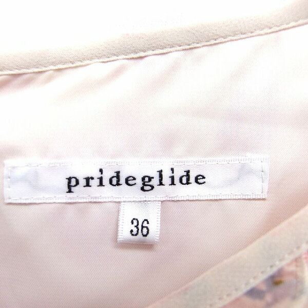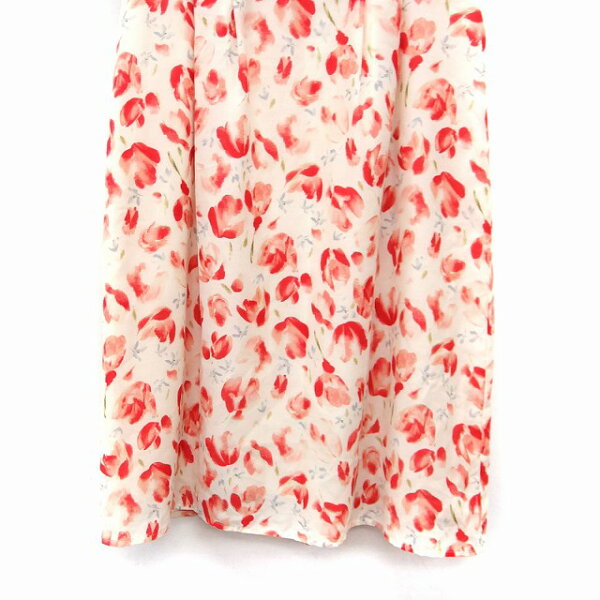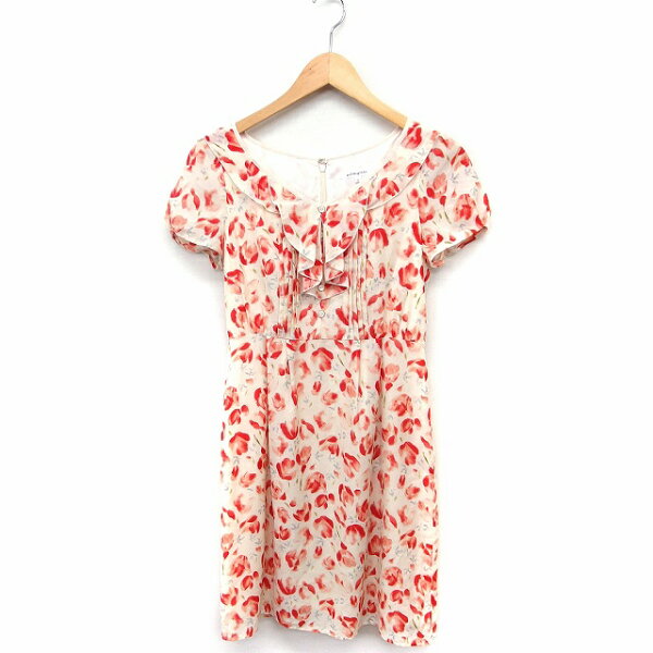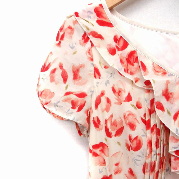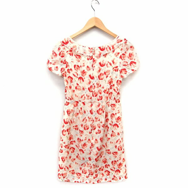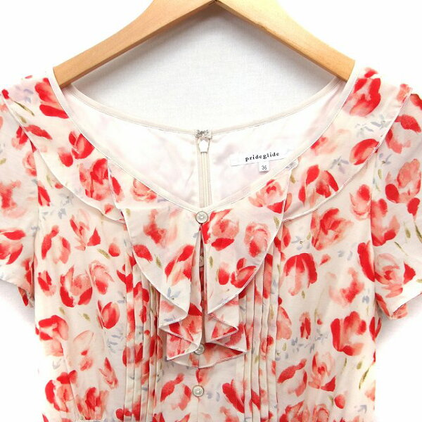 【中古】プライドグライド prideglide 花柄 フリル ワンピース ひざ丈 半袖 Vネック 36 アイボリー 白 レッド 赤 /FT12 レディース 【ベクトル 古着】 220511