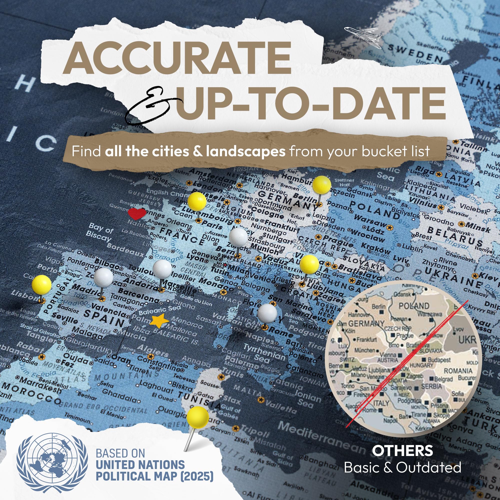 当社は旅行、実用的なデザイン、地球に情熱を注いでいますが、何よりも、ピンアドベンチャーマップの中核である旅行用のピンで世界地図をデザインすることに情熱を注いでいます。 当社の世界詳細で最新のプッシュピンマップで、私たちは皆がもっと旅行をしたり、新しい冒険を求めたり、故郷の壁で生き続けることができる思い出をさらに作り出すよう促すよう努めています。 地図のデザインと地理 当社のプッシュピントラベルマップは、場所を読みやすくするために強化されたコンテンツの作成に重点を置いた熟練した地図製作者と一緒に設計されています。 旅行追跡用のピン付きの世界地図を購入したい方には、より具体的な場所をキャプチャでき、冒険をピン留めするためのスペースを確保できる大きなサイズのプッシュピン世界地図をお勧めします。 主な地理的特徴 24インチ x 32インチ。 その他の地理的地図機能 30インチ x 40インチ。 40インチ x 53インチ。 プレミアムで長持ちする品質を保証。 当社の地図はすべて博物館品質のアートプリントで、鮮やかな色のためにアーカイブインクで印刷されています。 厚手の310gのコットンキャンバスに印刷。 フォームボードに取り付けてしっかりと固定。 厚さ1インチの木製ストレッチャーバーにギャラリーラップ。 ピンサイズ:0.25インチ x 0.65インチ 旅行が好きで、優れたデザインを重視し、地球に優しいプッシュピンマップでインテリアを盛り上げたいと思っているなら、ピンアドベンチャーマップが最適です。