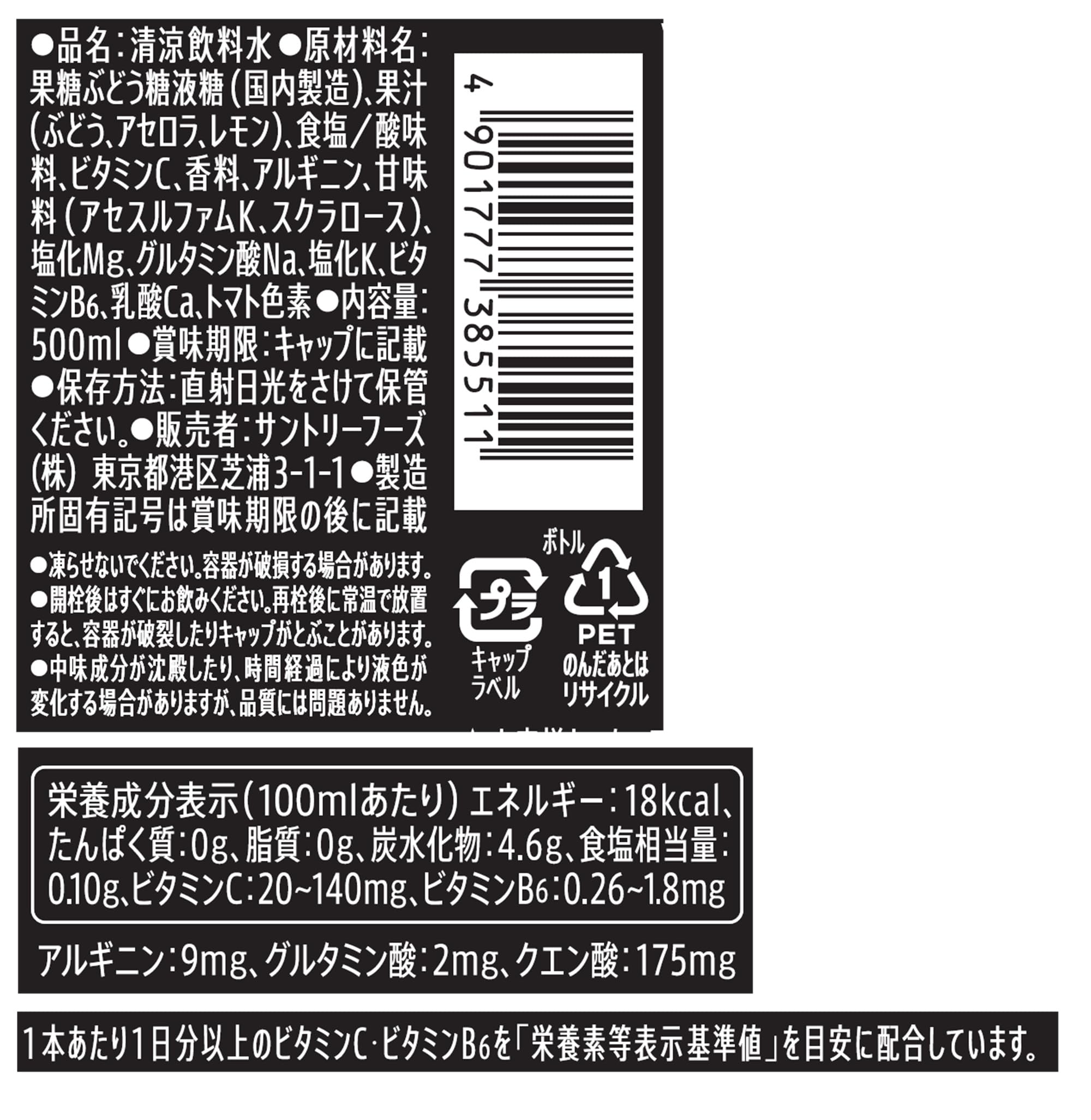 | 特記すべき原材料: | 果糖ぶどう糖液糖(国内製造)、果汁(ぶどう、アセロラ、レモン)、食塩、酸味料、ビタミンC、香料、塩化Mg、塩化K、ビタミンB6、乳酸Ca、トマト色素 |