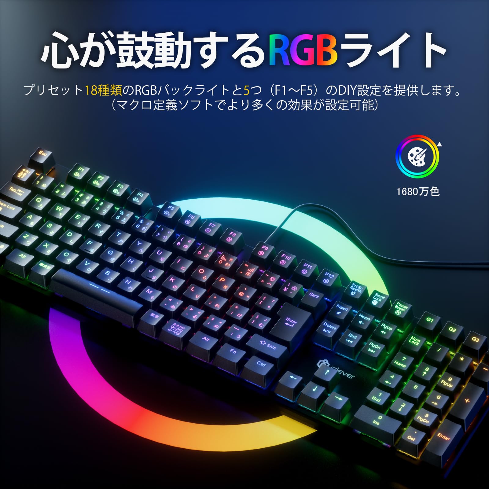 | キーボードの説明: | 標準JIS配列、フルサイズ、赤軸、マクロ機能、RGB、5000万回のキー寿命 |