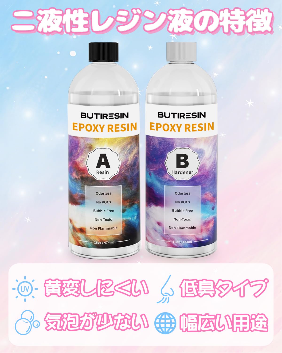 | 含まれるコンポーネント: | 二液性レジン液64OZキット |