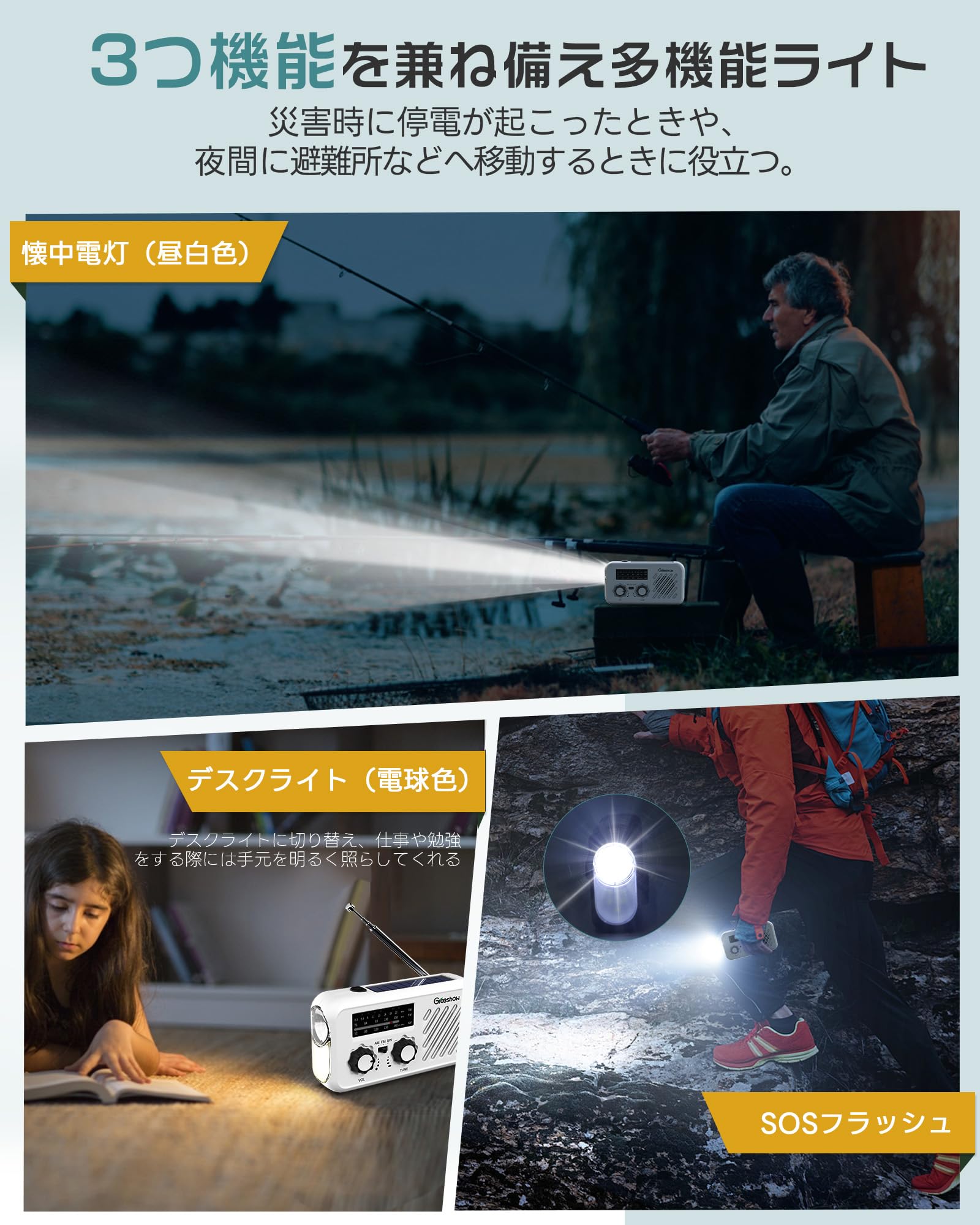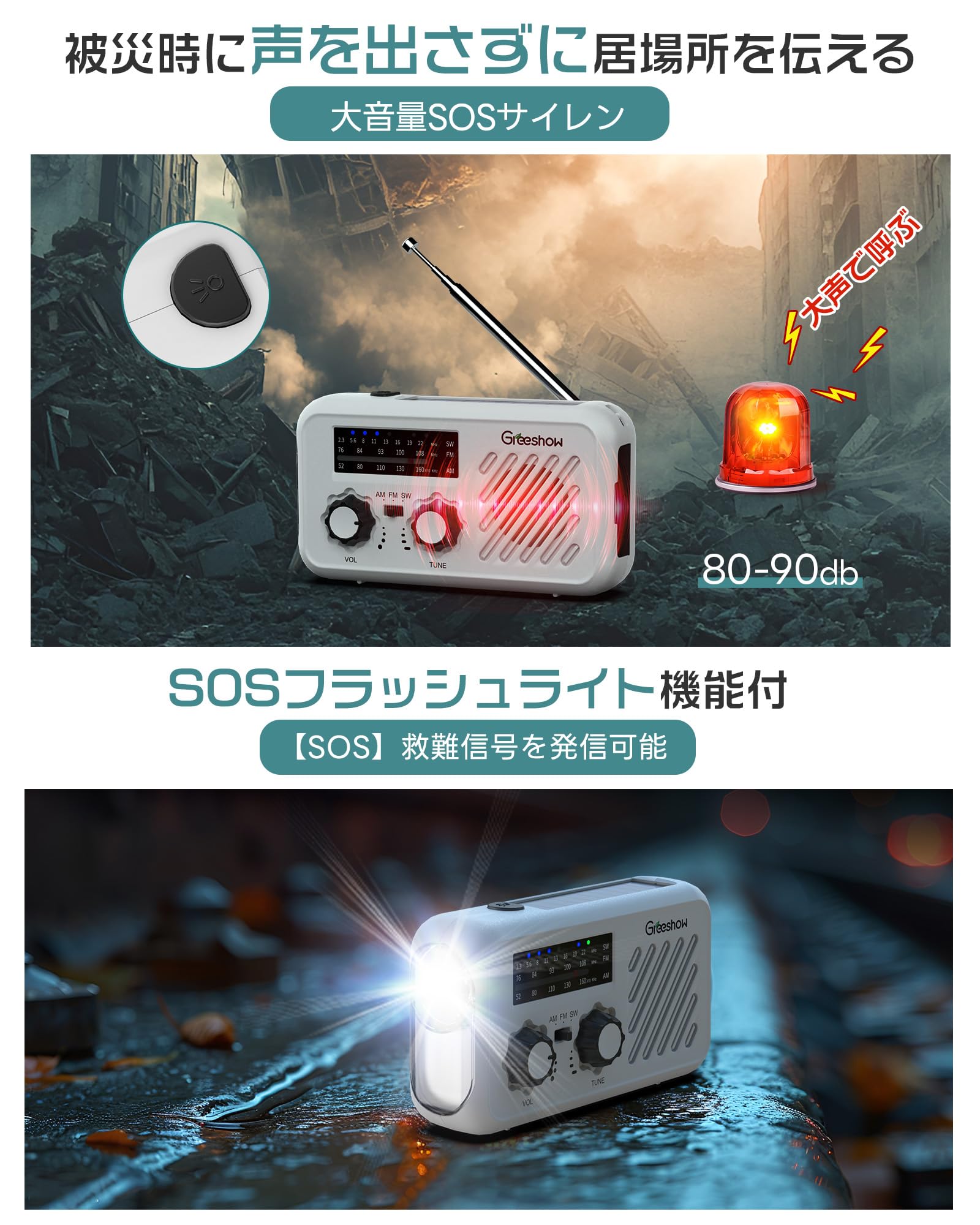 | 商品の追加説明1: | AM/FM/SWラジオ高感度受信,3.5mmイヤホンジャック,懐中電灯,モバイルバッテリー,SOSライト/サイレン |