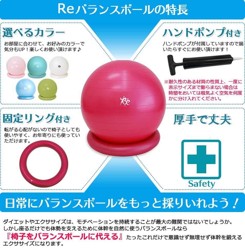 | 付属コンポーネント: | バランスボール、ボール固定用リング、ハンドポンプ、栓抜き、栓(ボール用×2、リング用×2)、取扱説明書 |