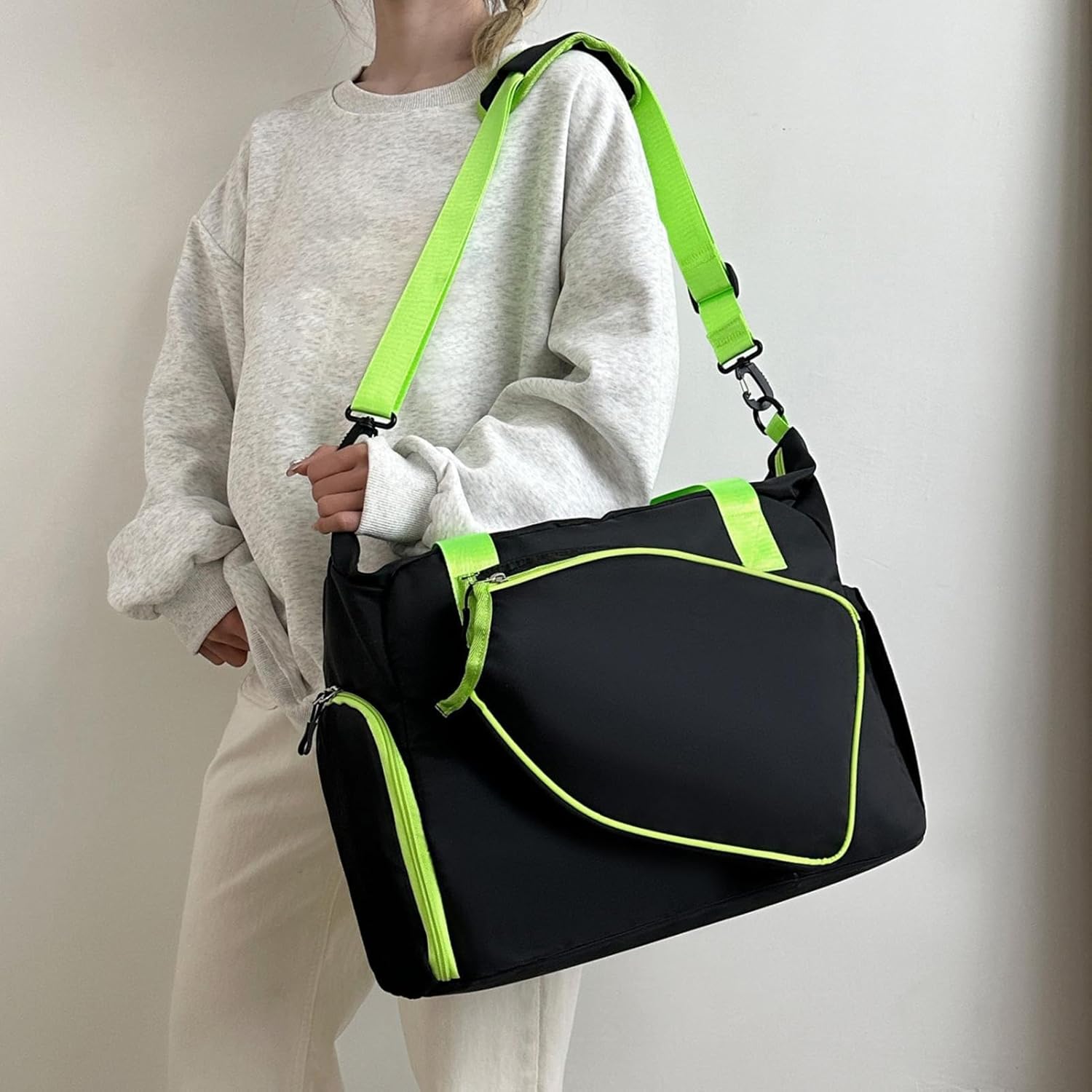 This fashionable shoulder bag is designed to meet the demands of lifestyles. Featuring a waterproof exterior and thoughtful organization with compartments for rackets, shoes, and personal items, it ensures practicality for outdoor activities. A water bottle holder and ample storage space cater to family trips, workouts at the gym, or daily commutes to the workplace. Its versatility makes it perfect for pickle ball, tennis, badminton, and more.