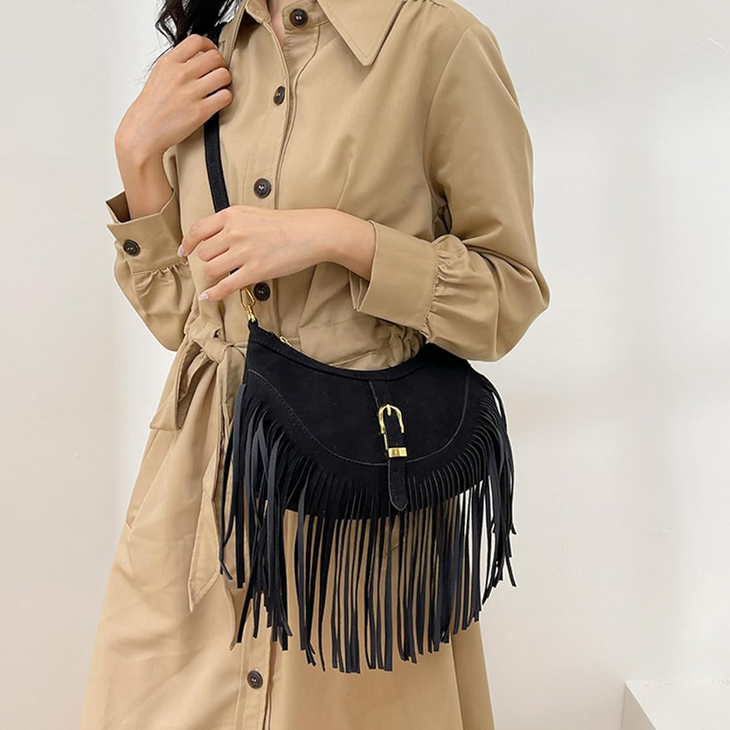 PUレザー、タッセル装飾、調節可能なショルダーストラップから作られ、耐久性と整理された収納のための十分なスペースを確保します。