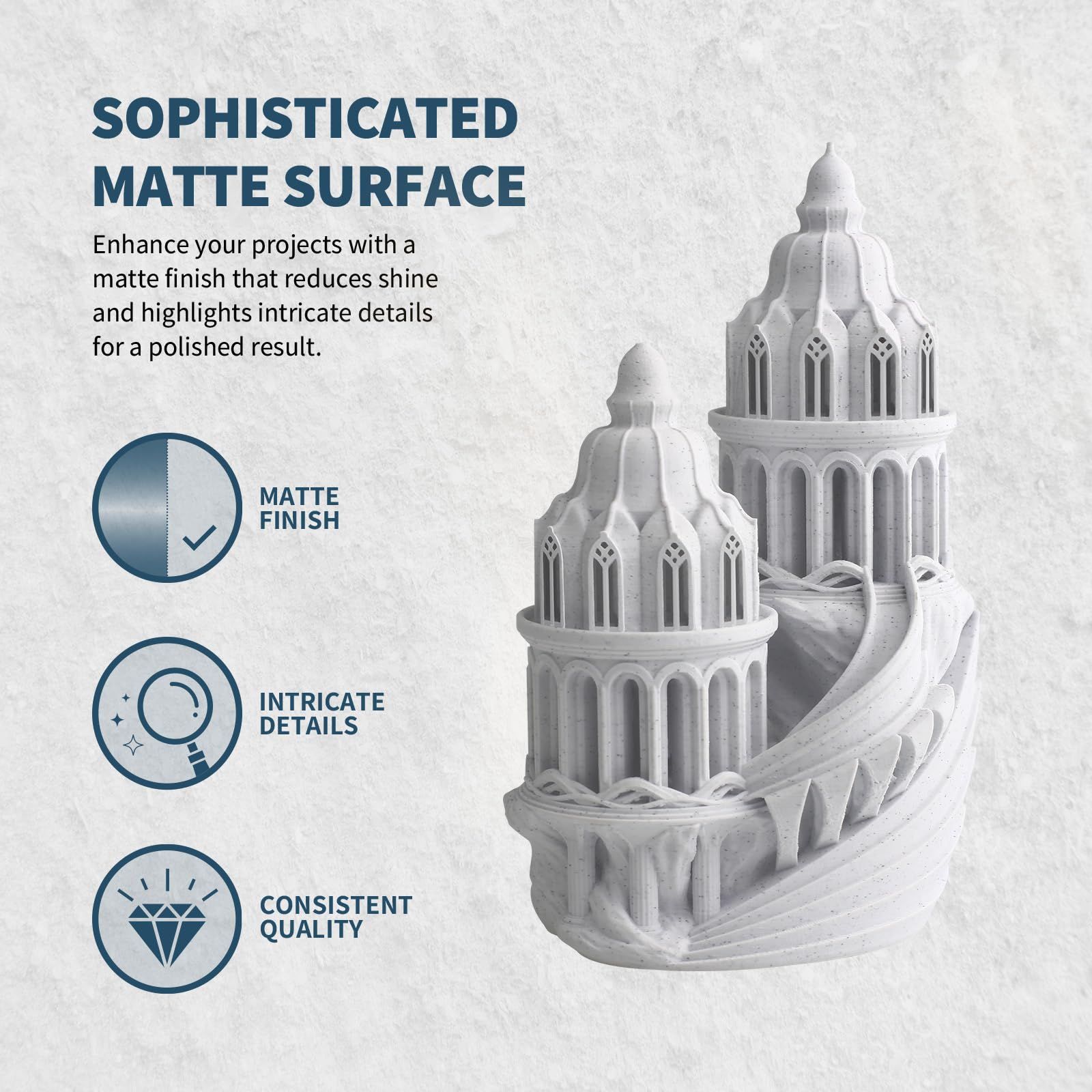 【多彩な応用】趣味の人でもプロでも、Overture Rock PLAフィラメントは無限の可能性を提供します。魅力的な彫刻、建築模型、または装飾品を作成するために使用し、あなたの創造性を発揮してください。
