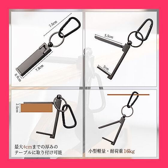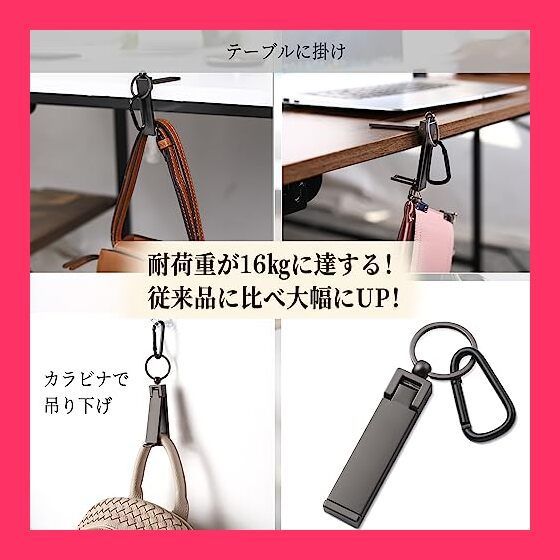*【軽量が大耐荷重】リングの取付部分が折れないに改良した!!耐荷重16kgを誇ります。最大4cmまでの厚みのテーブルに取り付け可能。通勤バッグ、トートバッグ、ランドセルなどに限らず、日常的に使うバッグ、傘などに対応するフックです。