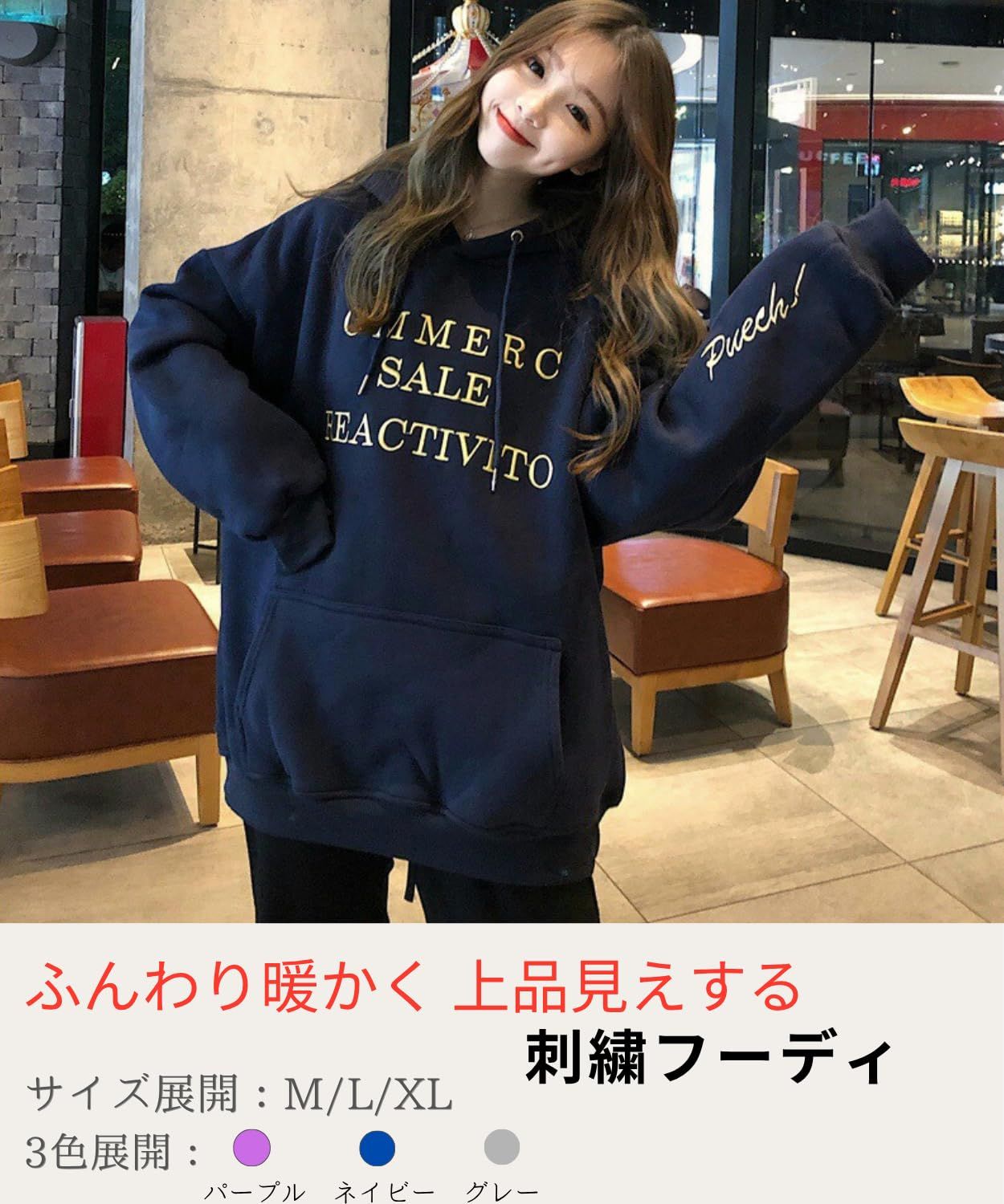 【素材・サイズ】厚手スウエットにベルベットタッチ刺繍を組み合わせた柔らか素材で、肌当たりが優しい長袖トップス。ゆったりしたオーバーサイズ設計で、大きいサイズにも対応。可愛いパーカーとして毎日使えるほか、ルームウェアとしても快適です。可愛い服レディースが好きな女性にも取り入れやすく、刺繍パーカーの存在感がコーデを整えます。