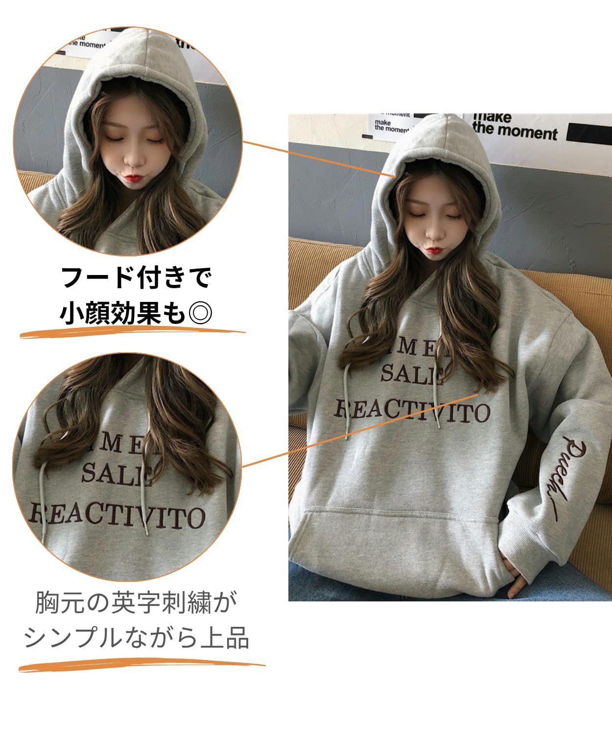 【特徴1】ゆったりとした可愛いパーカーで、厚手生地に立体刺繍がしっかり映えるデザイン。オーバーサイズパーカーならではの体型カバー力があり、大きいサイズを着たい女性にもフィットします。pullover