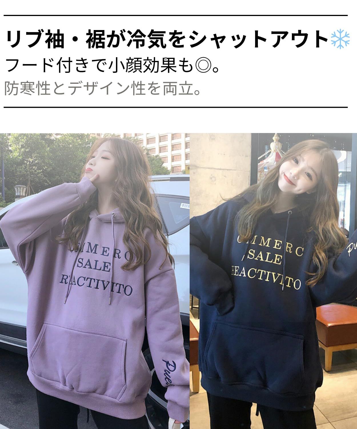 【特徴2】ベルベット風の刺繍スウェットは柔らかく暖かい質感で、厚手スウエットでも動きやすいのが魅力。ゆったり感が程よく、可愛いパーカーを探している女性にぴったりです。カジュアルにもフェミニンにも合わせやすく、pullover