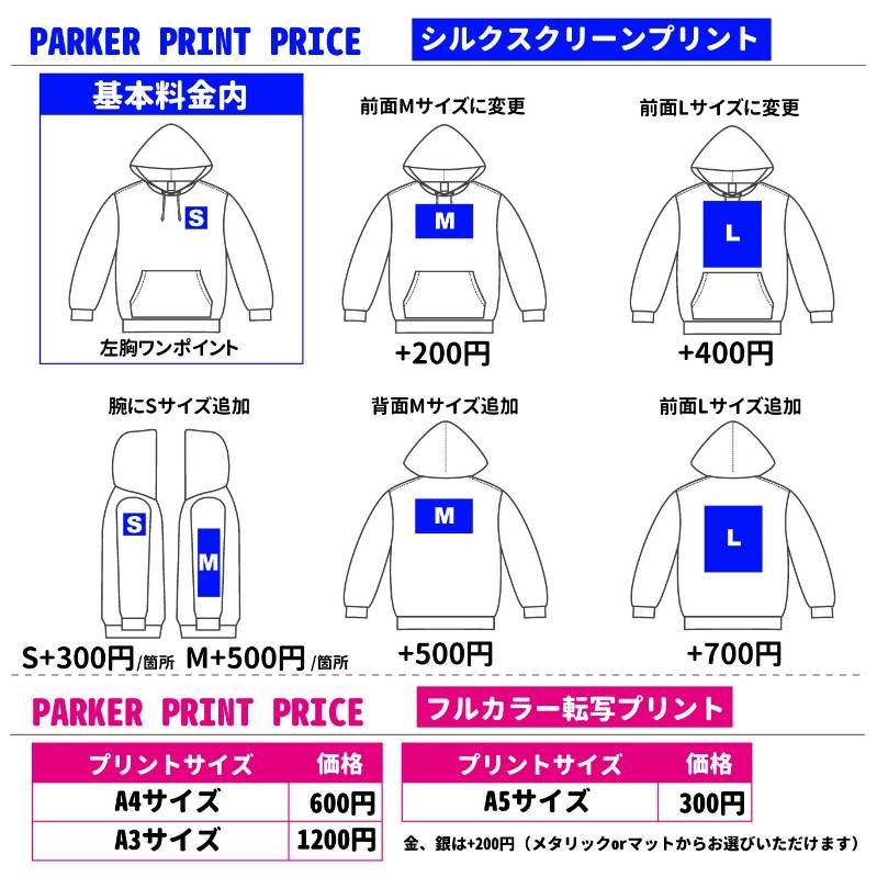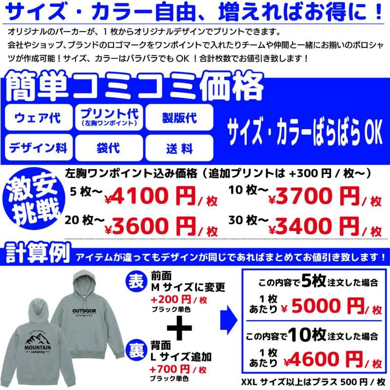 オリジナルパーカーの作成はIGNITE-STYLEにお任せください。 カフェ、居酒屋、スタッフT、ユニフォームなど幅広くご利用いただいております。 オリジナルTシャツをスタッフ、チーム、クラブ、クラスT、ユニフォームなどで揃えてみませんか? ■プリント方法 シルクスクリーン印刷、フルカラープリント、ラバー転写プリント、昇華転写プリントよりお客様のご要望に合わせてご提案させていただいております。 アパレルブランドで使用されるプリント方法で作成いたしますのでご安心ください。 ■お見積もり、デザイン確認は無料 ご納得いただいてからご購入頂きますのでまずはお気軽にお問合せください! ■フォロー特典・・・1枚あたり100円お値引きさせていただきます! ? __________________ ■ご注文方法■ ①下記3点を教えてください  □ご依頼枚数・サイズ・カラー  □印刷箇所  □デザイン内容(画像がある場合は専用で出品をお願いします) ②イメージサンプル作成 ③ご購入後作成→発送 ※ 追加プリントは画像参照願います。 ※ パーカーカラー、サイズはバラバラでもOKです。 ※表示価格2000円は20枚以上無地でのご注文の場合の価格となります。 ??????????????????? ■納期  ご購入後、土日祝日を除く7?14日以内に発送いたします。  ※混み具合によっては前後致します。 ■注意事項  ご購入後のサイズ変更、カラー変更、デザイン変更はできませんので最終確認は必ずお願い致します。  ご購入後のキャンセルはできませんのでご了承願います。 ■取り扱い商品 Tシャツ、ドライTシャツ、ロングTシャツ、パーカー、スウェット、ブルゾン、キャップ、トートバッグ ステッカー、ミニノボリ、キーホルダー、ハンカチ