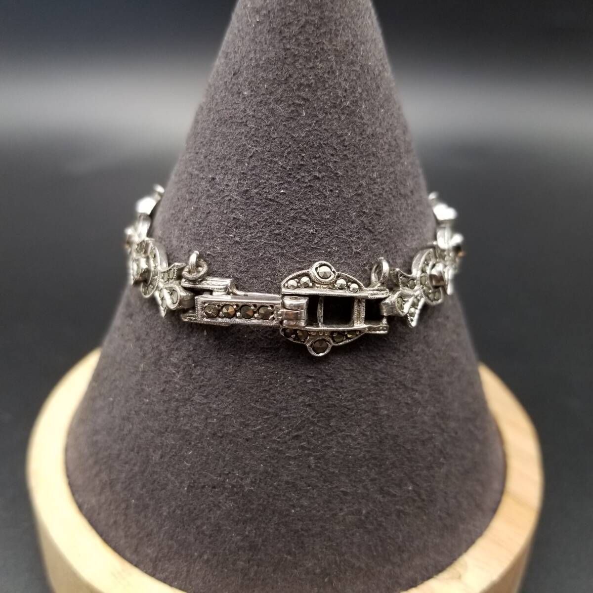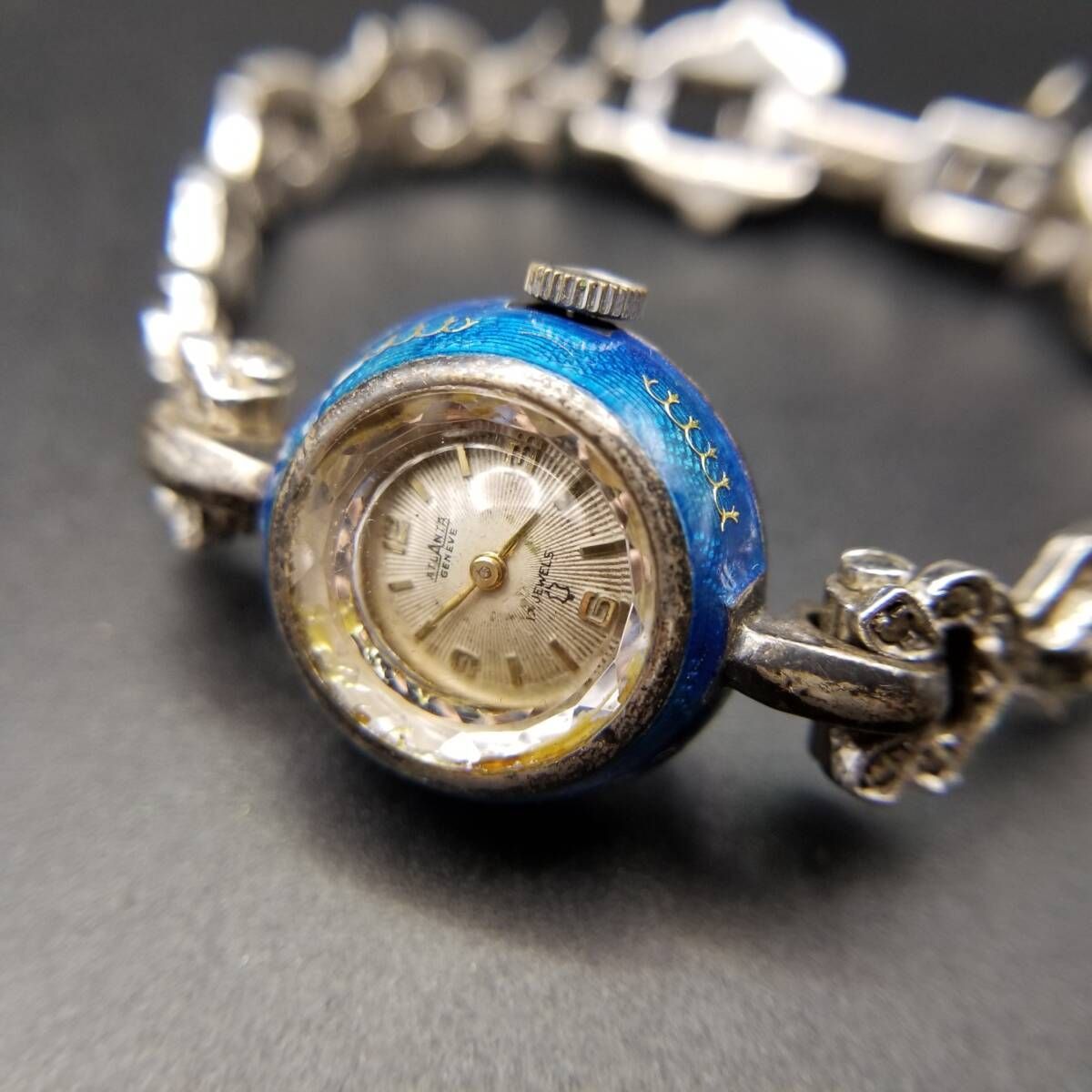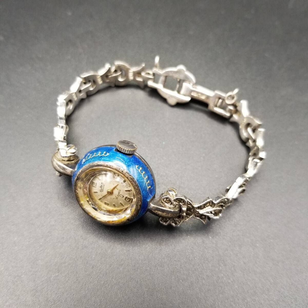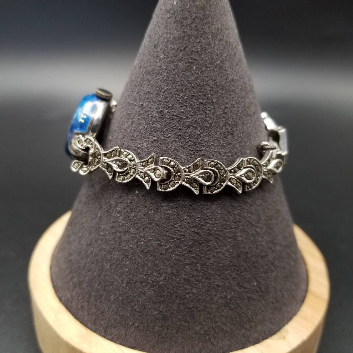 Atlanta Geneva Swiss ヴィンテージ 腕時計 手巻き ブルーエナメル ギロシェ マーカサイト装飾 ブレスレット 華奢 上品 エレガント Y23-Q