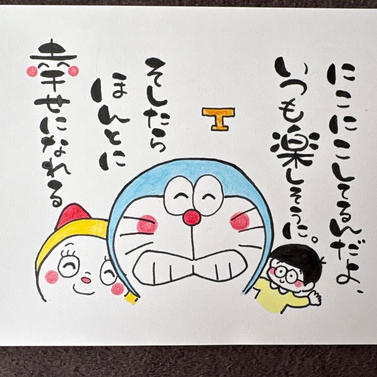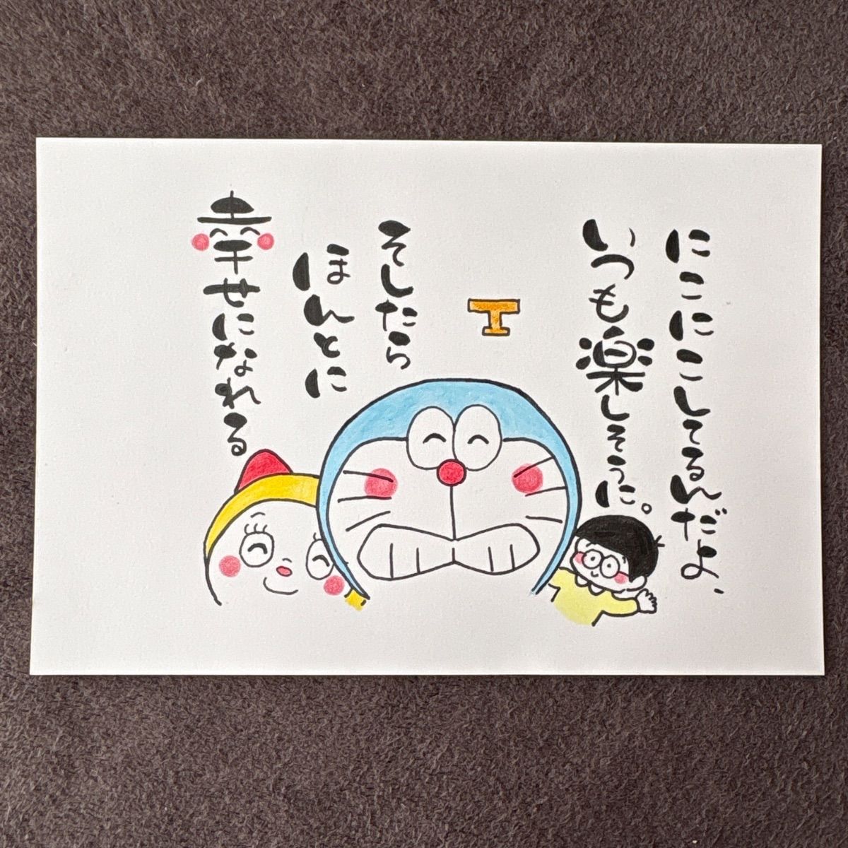 ドラえもんの名言を筆ペン、色鉛筆を使って書きました。素人作品、ハンドメイド商品にご理解いただける方、よろしくお願いいたします。 ドラえもん好きの方、小さなお子様に…いかがでしょうか。 平日普通郵便で発送いたします。