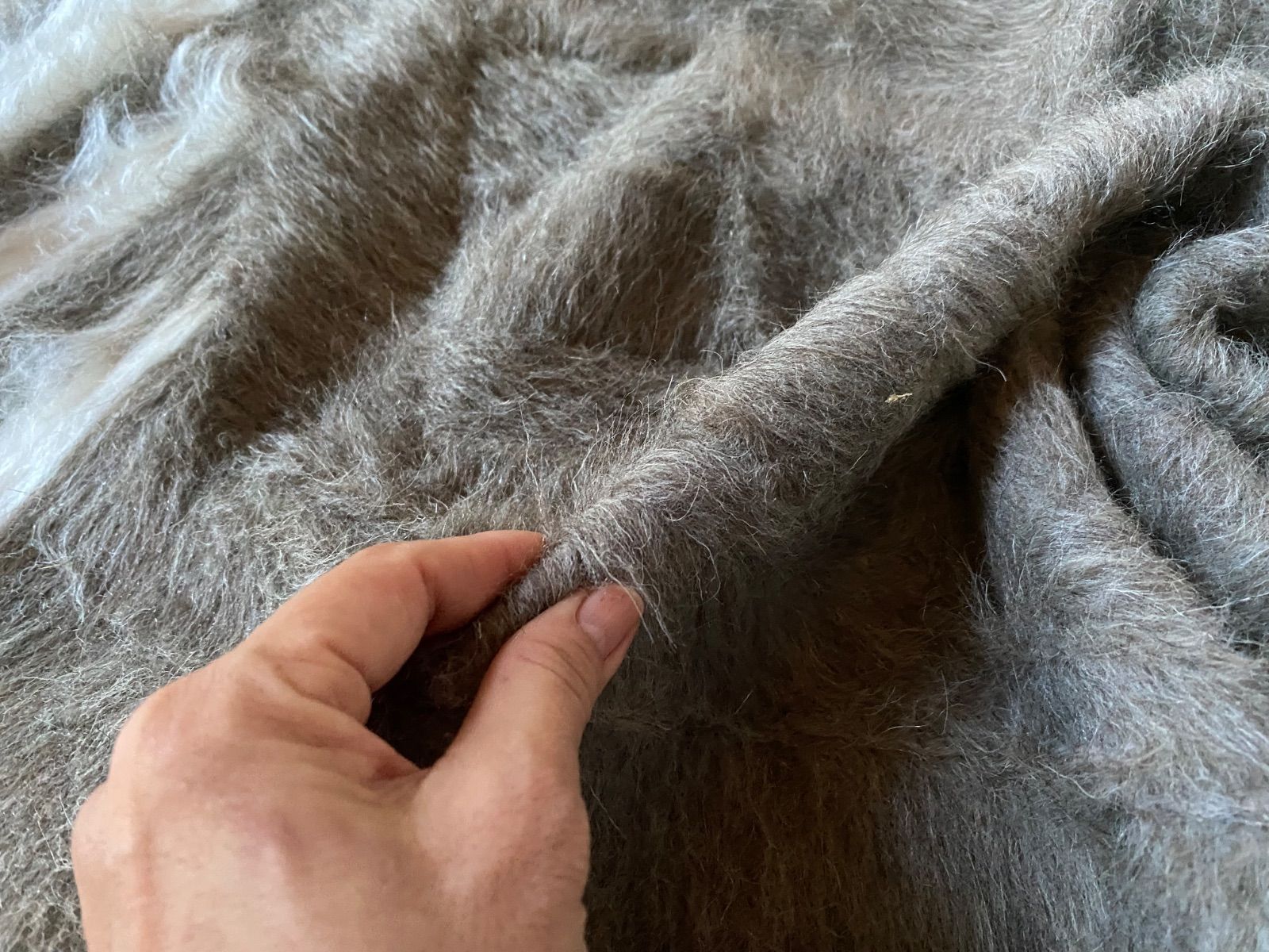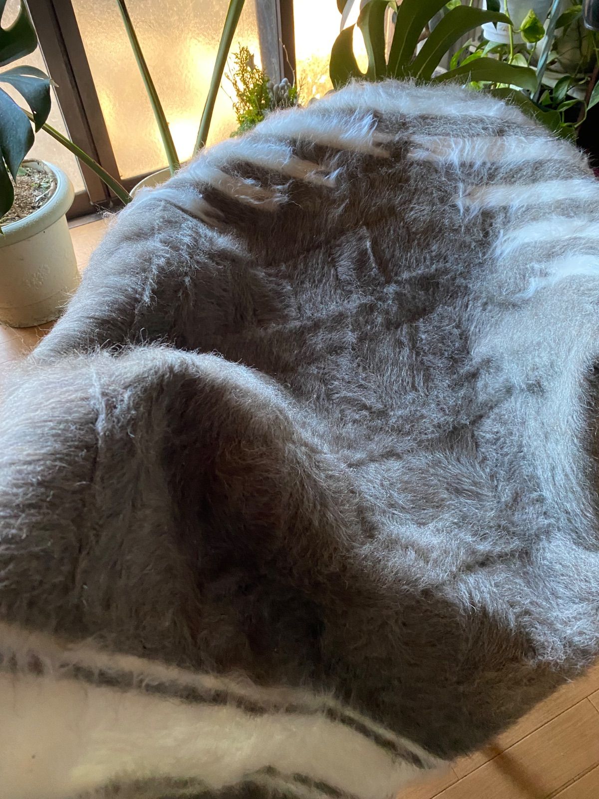 自然のヤギの毛で織られていますので、独特のくるくるとした感じも可愛く、とてもナチュ ラルな感じです。アンゴラ山羊は18世紀の中ごろまでオスマントルコが飼育を独占していたらしいです。 その後改良され、良質のモヘアとして世界的に発展していったそうです。モヘアと言えば、カシミヤと並ぶ素材ですね。山羊の毛ですので、羊より高級で暖かです。