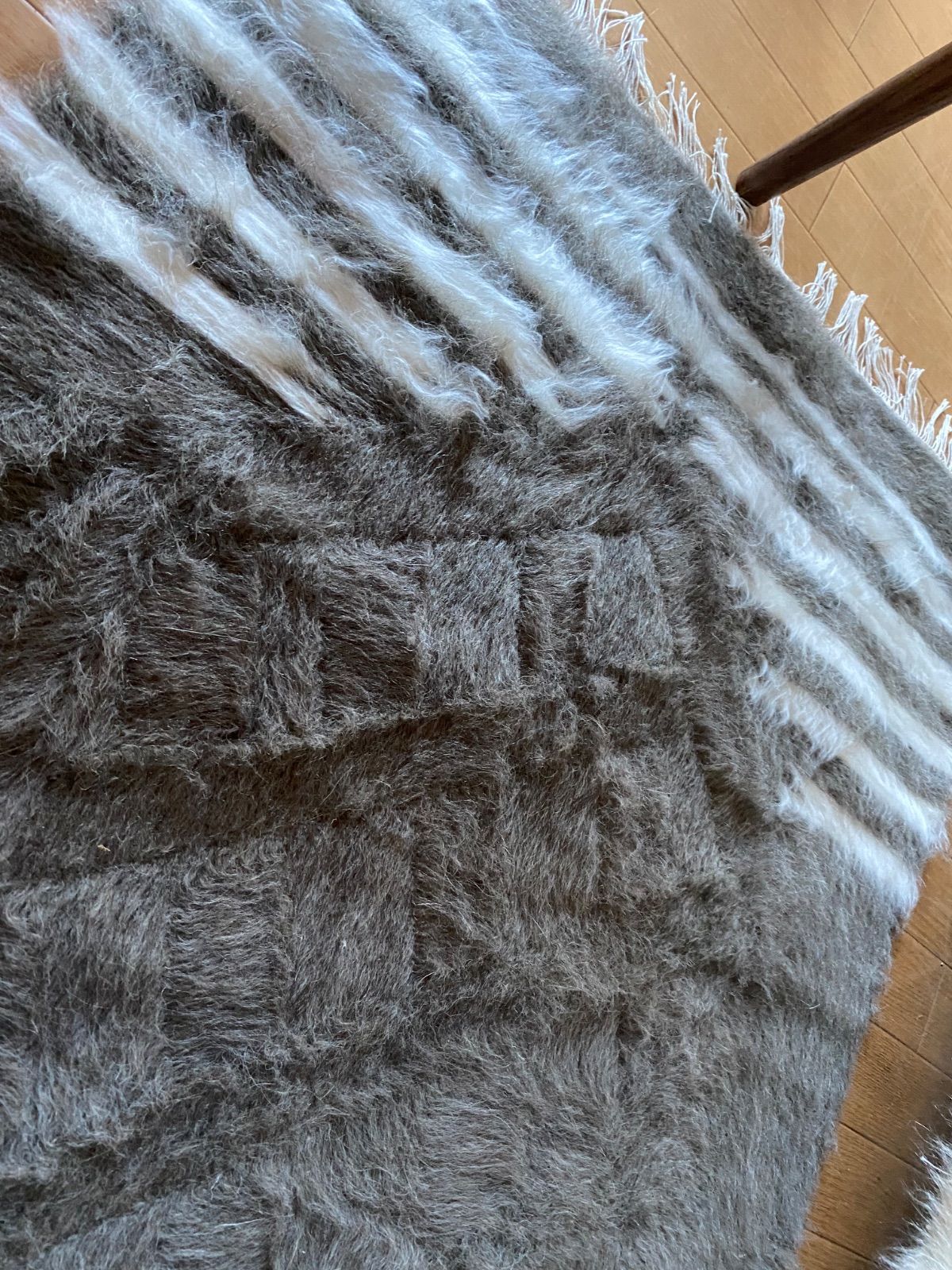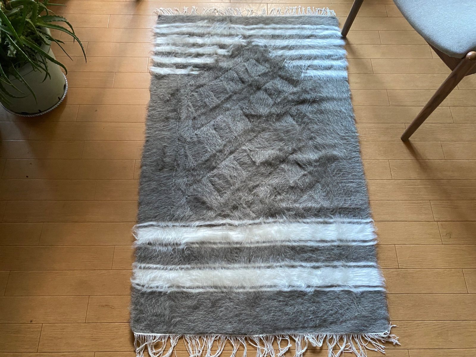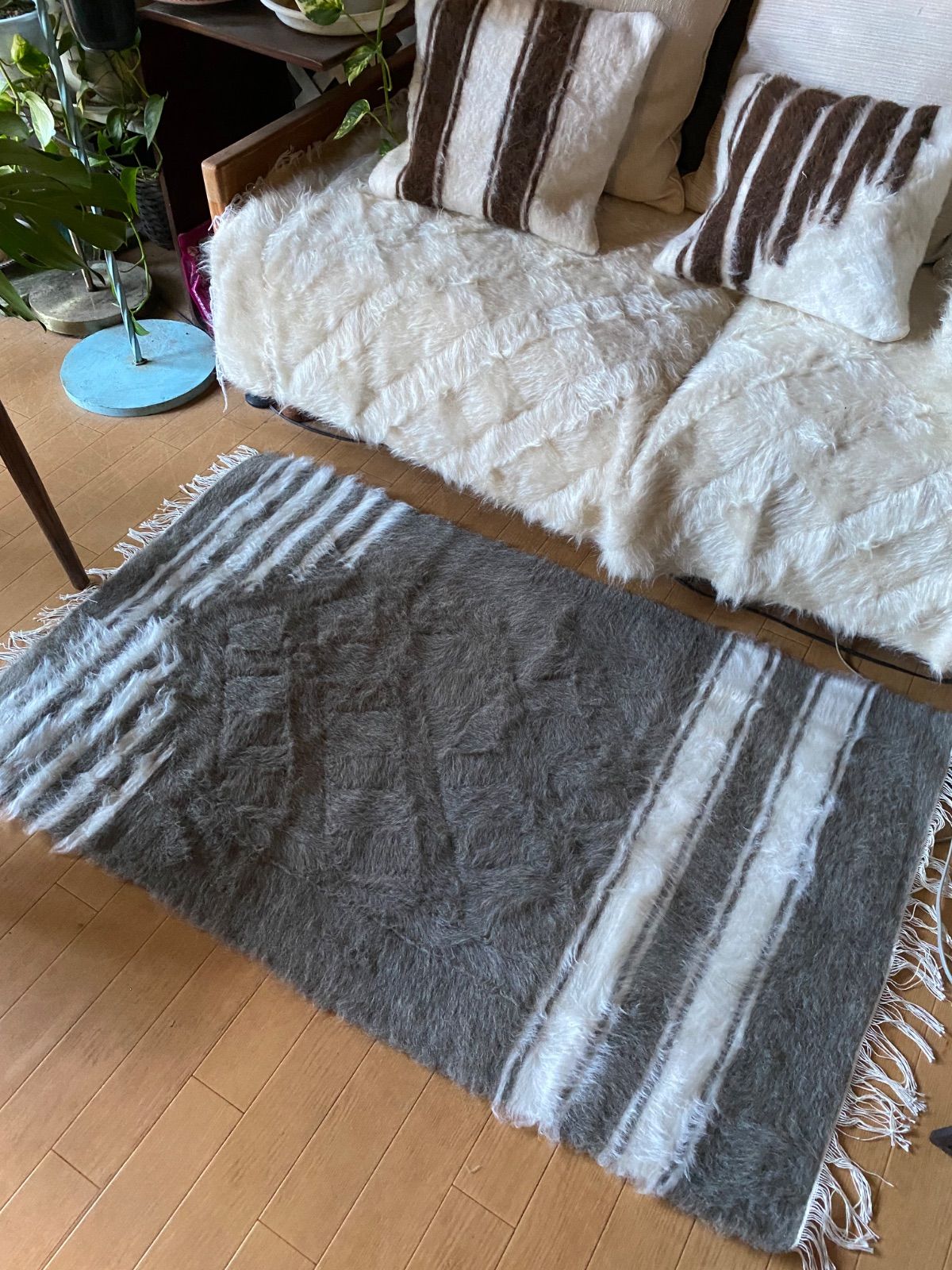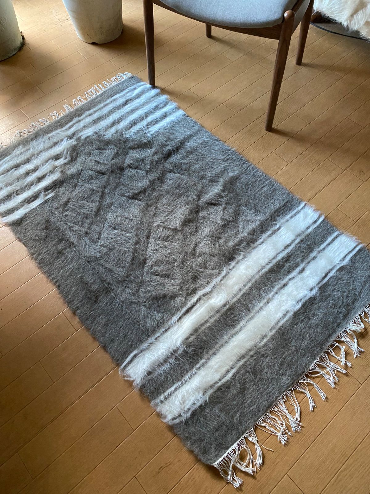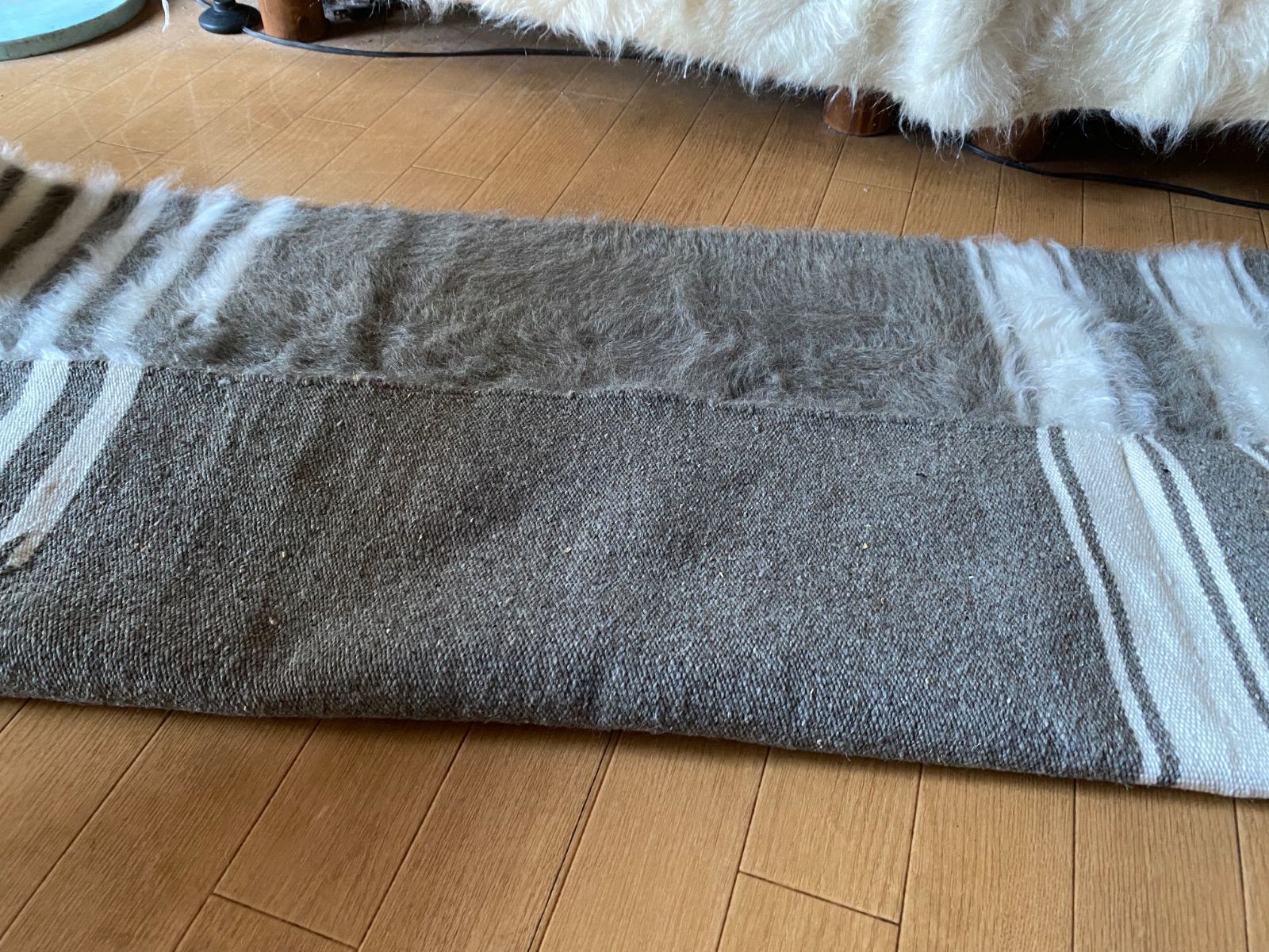 山羊ならではの模様をお楽しみください。 片面だけ毛が出ていて裏は毛がとってあるのだとおもいますので、裏面でお使いいただければ、普通のキリムとして も使えます。 冬は毛がある面で、夏は裏面でキリムとしてお使いいただける優れものです。 また毛のある表は毛をけばだたせて、模様も作っていますのでとてもおしゃれ度が高いです。 新品未使用品です。