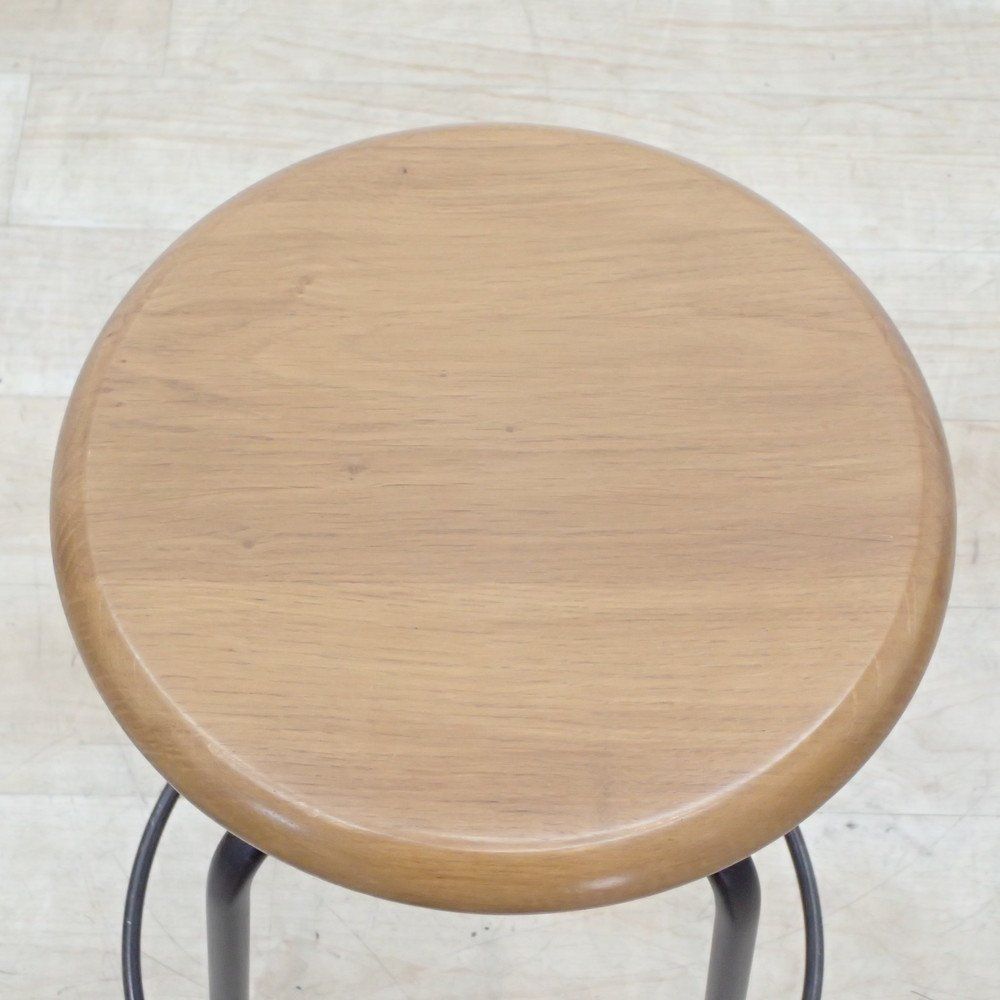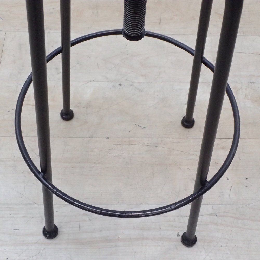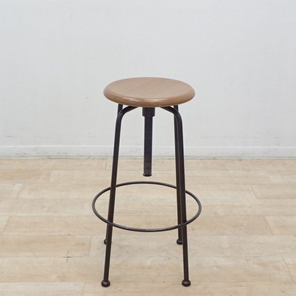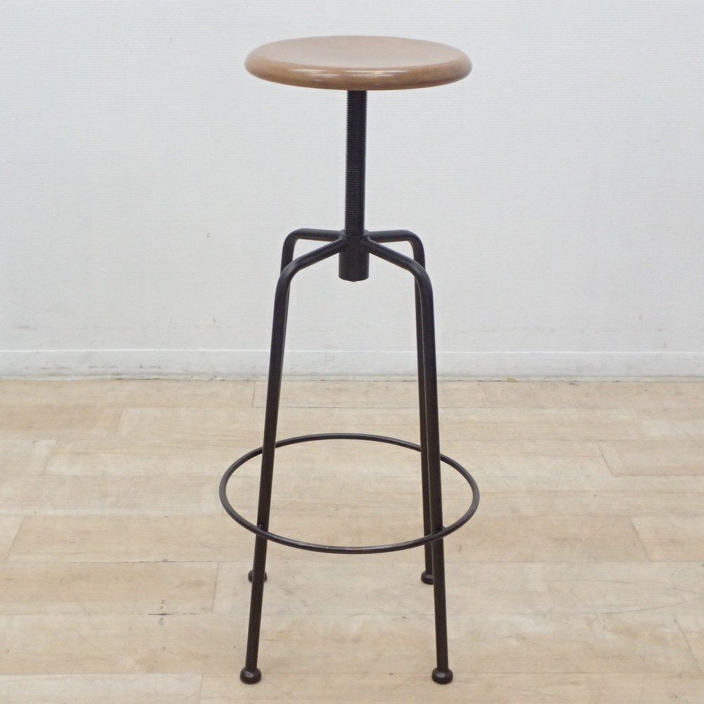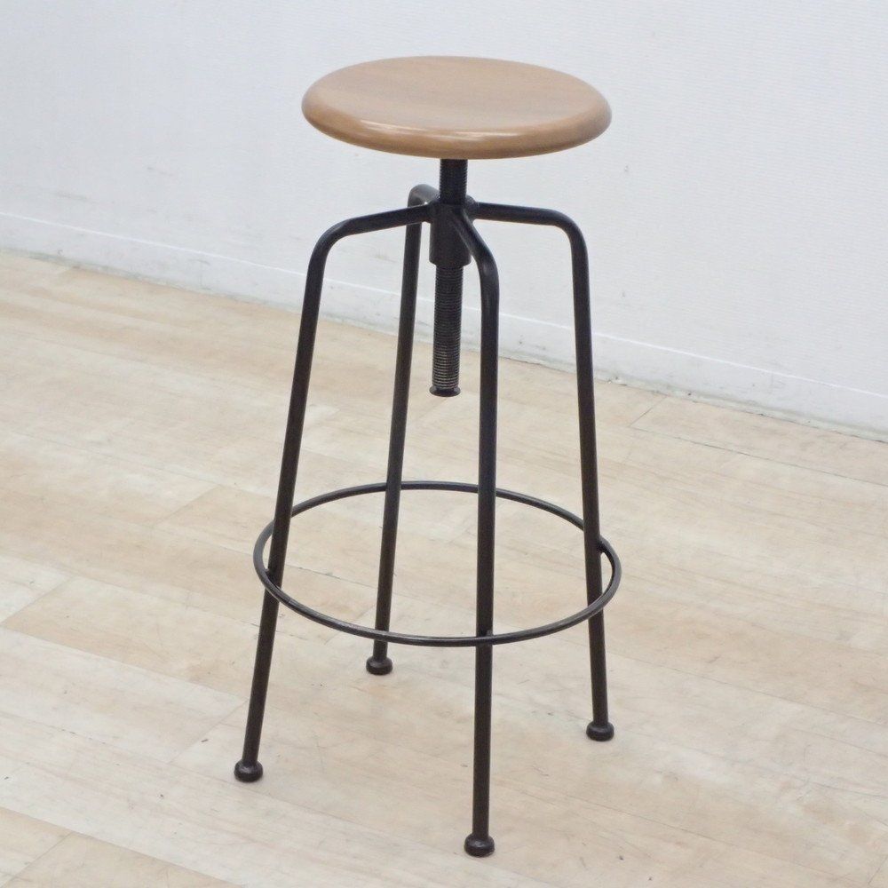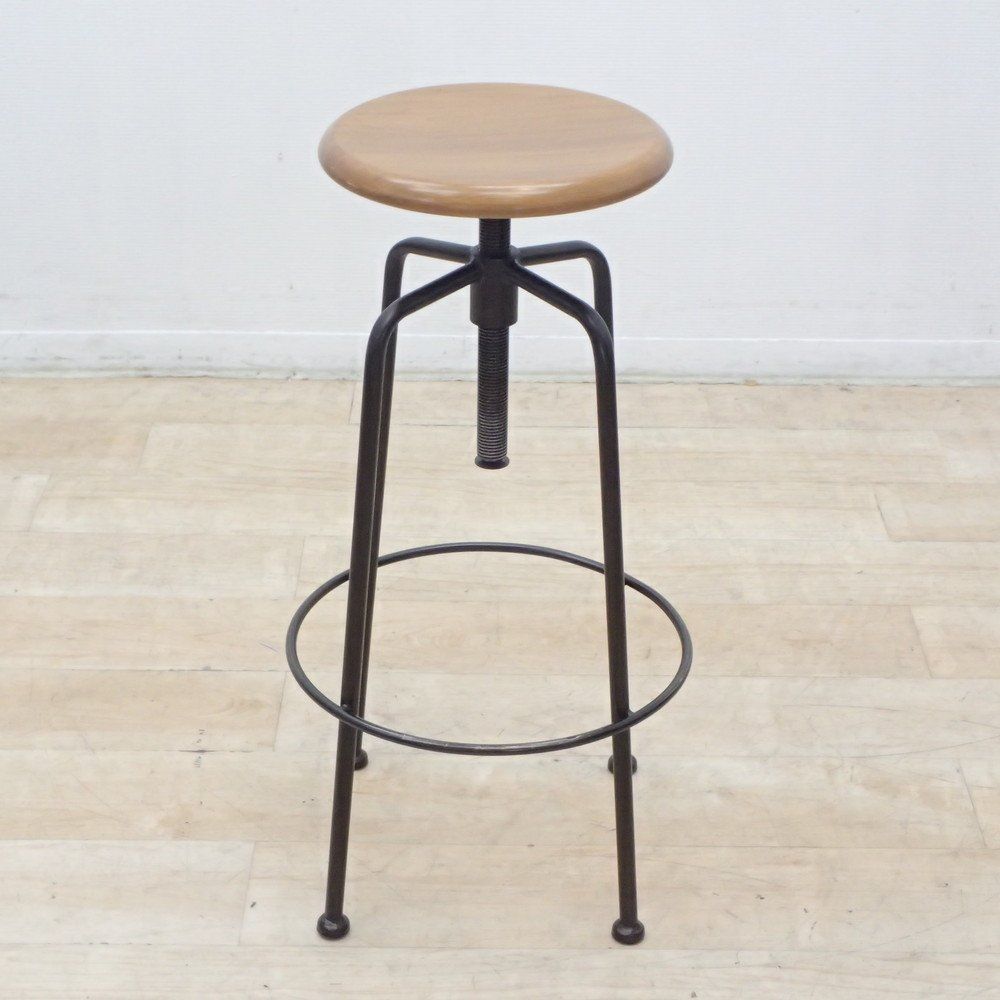 アイアン脚と木材座面との組み合わせがインダストリアルな雰囲気をまとわせる昇降式スツール。