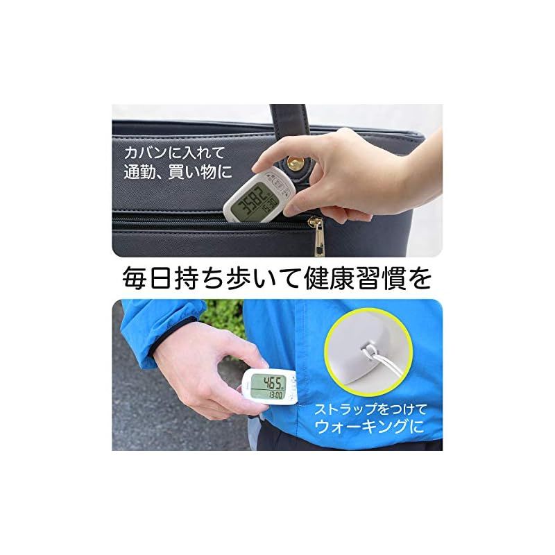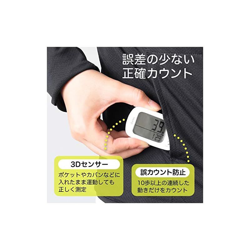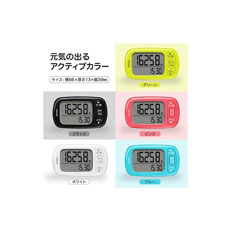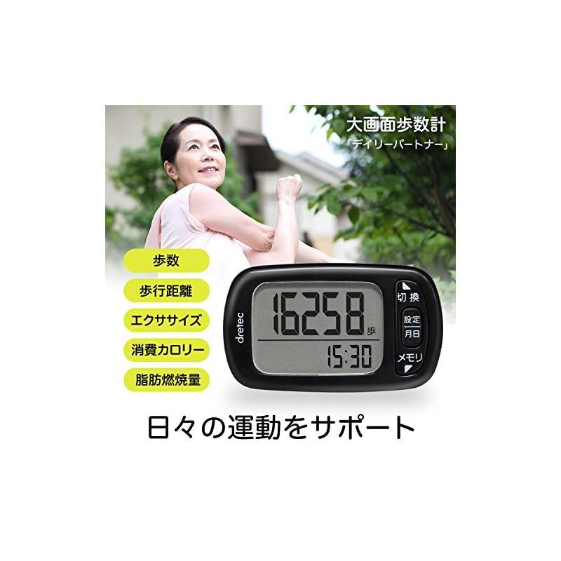 【商品概要】 【身近な健康管理に】毎日どのくらい歩いているのか、どれほど運動しているのか気になったことありませんか。運動不足気味の方や健康志向の方におすすめなのが歩数計です。歩数だけでなく消費カロリーや脂肪燃焼量、歩行距離、エクササイズ(Ex)の5項目で運動量を管理できます。30日間は記録が残るので、目標も立てやすく、毎日の習慣化に繋がります。日々のウォーキングを歩数計で管理してみませんか。 【ポケットやカバンに】ポケットやカバンなどに入れたまま運動しても計測できる3Dセンサーが内臓されています。動いている時も邪魔にならないので、思いっきり運動をすることができます。誤アカウントしないように10歩以上連続して歩いた場合だけ測定しますので、ほぼ正確な値を知れます。 【大画面表示】大きな文字で歩いた歩数を表示してくれる見やすい大画面タイプ。便利な時計表示付きです。ストラップなどを付けれるひも通し穴付。(ストラップは付属していません) 【アクティブカラー】男女を問わないシンプルな形状。ホワイト、ブラック、ピンク、ブルー、グリーンの5色。 【商品仕様】本体サイズ:高さ4.0cm×幅6.6cm×奥行き1.2cm、本体重量:24g、素材:ABS樹脂、アクリル、最大計測表示:99999歩 (歩数)、999.99km (歩行距離)、9999kcal (消費カロリー)、999.9g (脂肪燃焼量)、99.9Ex (エクササイズ)、電源:リチウム電池 (CR2032×1個) 【商品説明】 【商品詳細】 ブランド:ドリテック(dretec) 商品種別:歩数計 商品名:dretec(ドリテック) 歩数計 大画面 消費カロリー エクササイズ表示 3Dセンサー 30日間メモリー H-235WT ホワイト 製造元:dretec(ドリテック) 商品番号:H-235WT 発売日:2017年09月20日 商品内容:W6.6×D1.3×H3.9cm 色:ホワイト