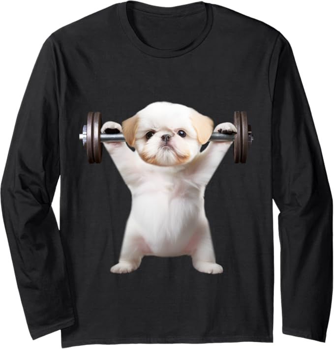 送料無料 100%コットン (筋トレ 犬) 面白い長袖Tシャツ メンズ レディース かわいい ユーモア パロディ 柔らかい肌触り 快適 軽い 通勤 部屋着 春秋「背面印刷可、備考必須」