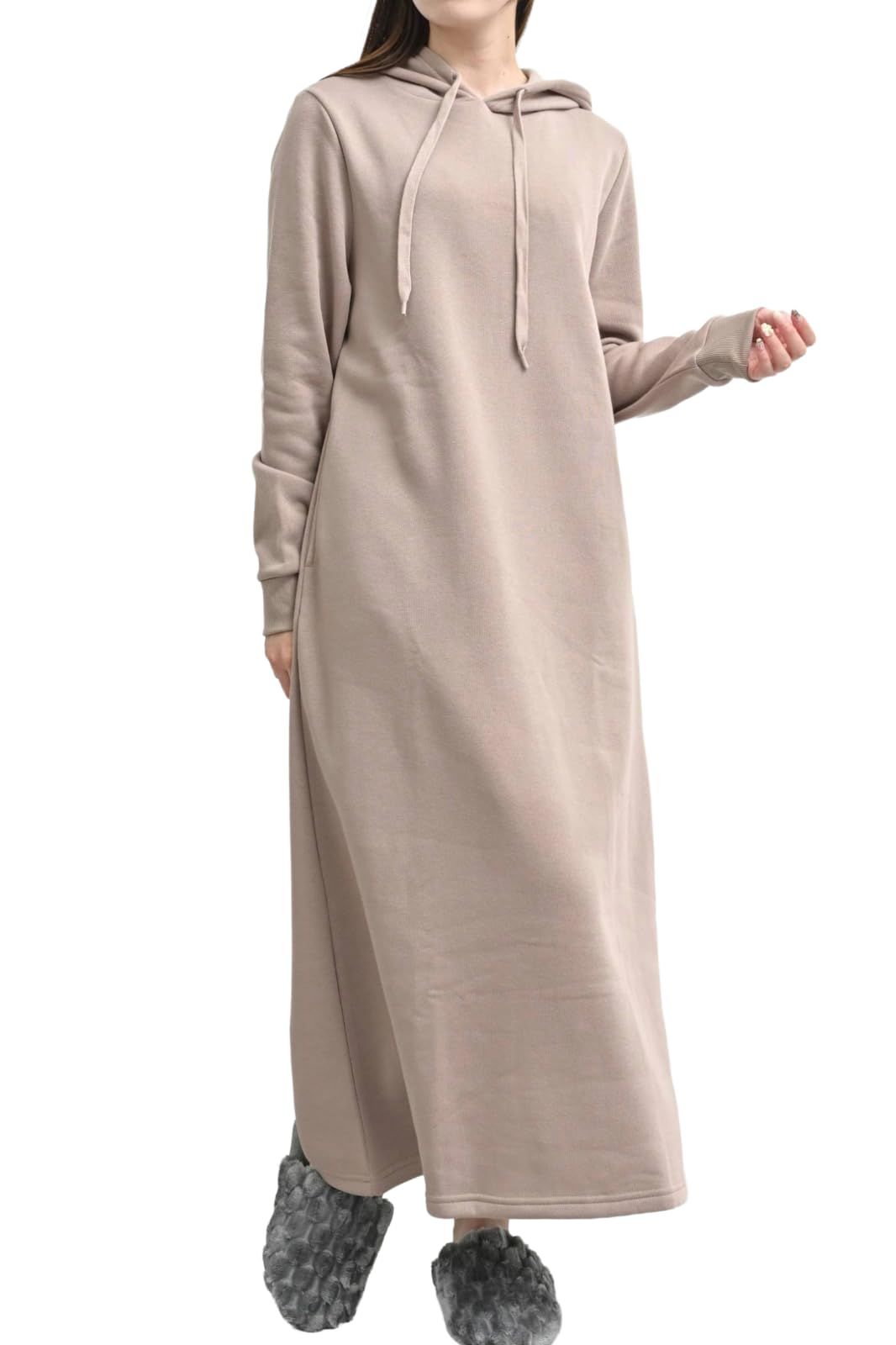 [MORE AUNI] ルームウェア ワンピース レディース 長袖 裏起毛 パジャマ 部屋着 フード付き パーカー マキシ丈 ロング丈 暖かい カジュアル 秋冬 もこもこ ゆったり M L LL 大きいサイズ マタニティ [グレージュ / 8224] [M]
