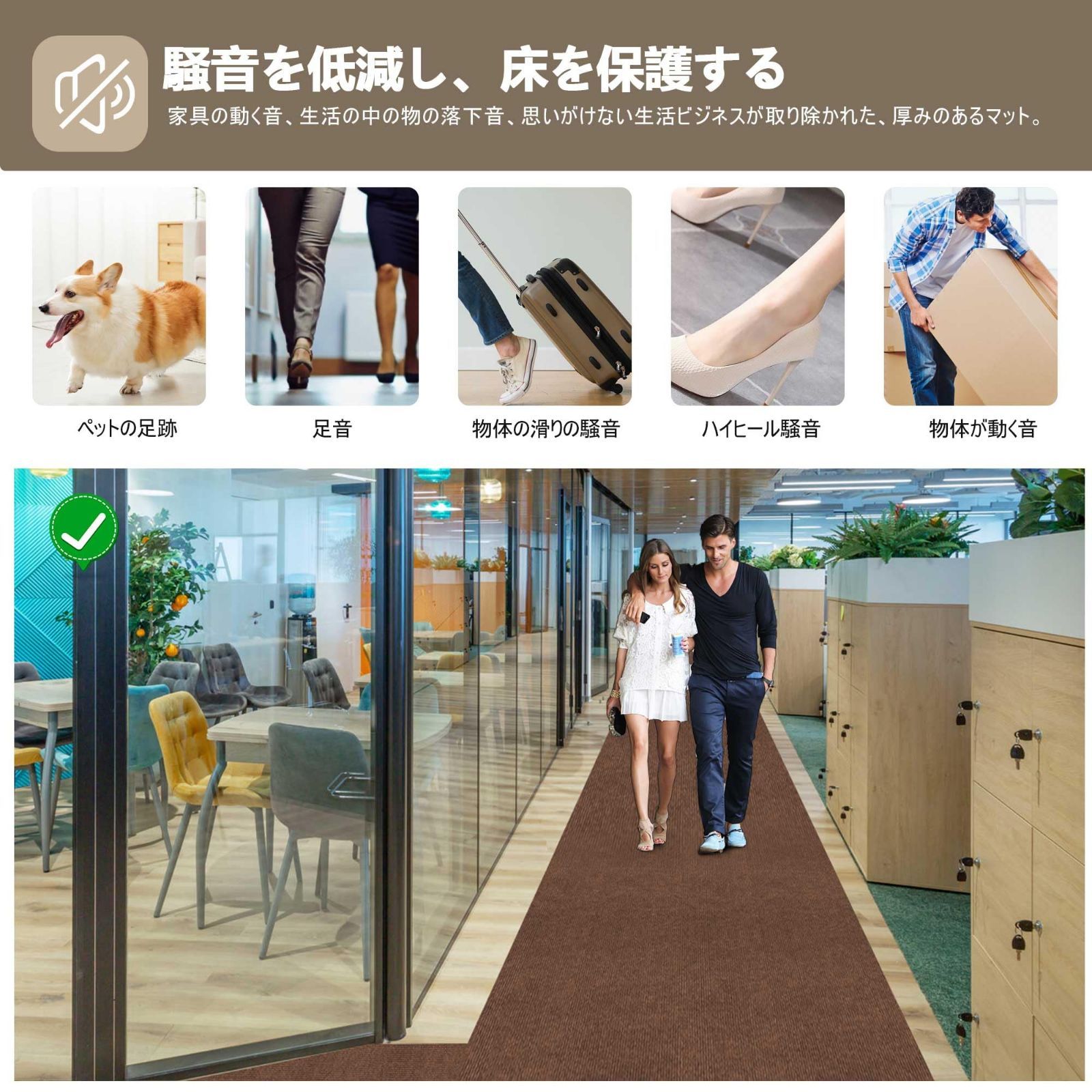 【騒音防止+傷防止】廊下マットはPUとポリエステル不織布材料を用いて作られ、吸音性に優れ、様々な場所に適している。子供が走って遊ぶ音、ペットの爪が床に当たる音、椅子の摩擦音、ゲームをする音など、小さな生活音を吸収し、騒音を低減することができます。廊下のマットの底の自己吸引材は廊下にしっかりと貼り付けられており、冬には足を保護し、冷たい床を遮断することもできます。
