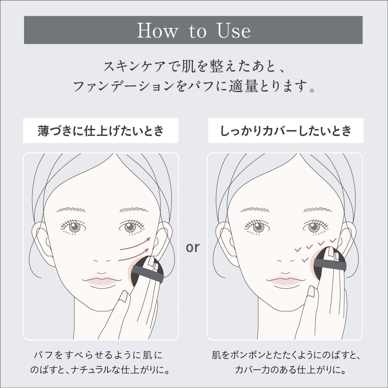 肌をいたわるやさしいタッチで、キメ細かく均一な肌に仕上げるパフ付き。キメ細かく均一にパフにつくため、肌にも均一に塗布でき、テクニックレスで美しく仕上がります。