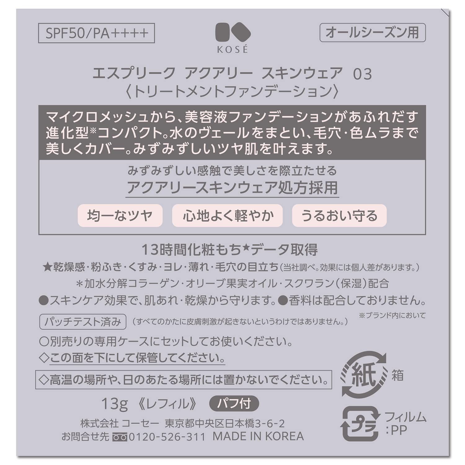 ESPRIQUE(エスプリーク) アクアリー スキンウェア 03 ミディアムベージュ ファンデーション SPF50/PA++++ ツヤ肌 毛穴 カバー 美容液 保湿 裏ごしファンデ 13g