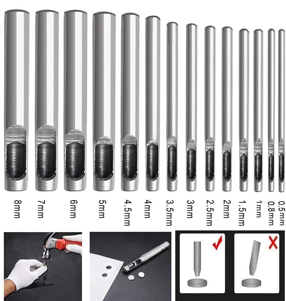 【パッケージの内容】直径サイズ(約)は0.5mm、0.8mm、1mm、1.5mm、2.0mm、2.5mm、3mm、3.5mm、4mm、 4.5mm、5mm、6mm、7mm、8mmの14種類ポンチセットで、、様々の穴を実現、皮革、ベルトやシートガスケットなどの穴あけ作業、ビニールシートや、テント生地の穴あけに最適です。