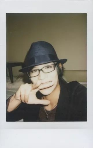 【中古】生写真(男性) ギルド/YOSHIHIRO/バストアップ・衣装黒グレー・帽子・眼鏡・右手指3本立て前・首傾げ・背景白/生チェキ
