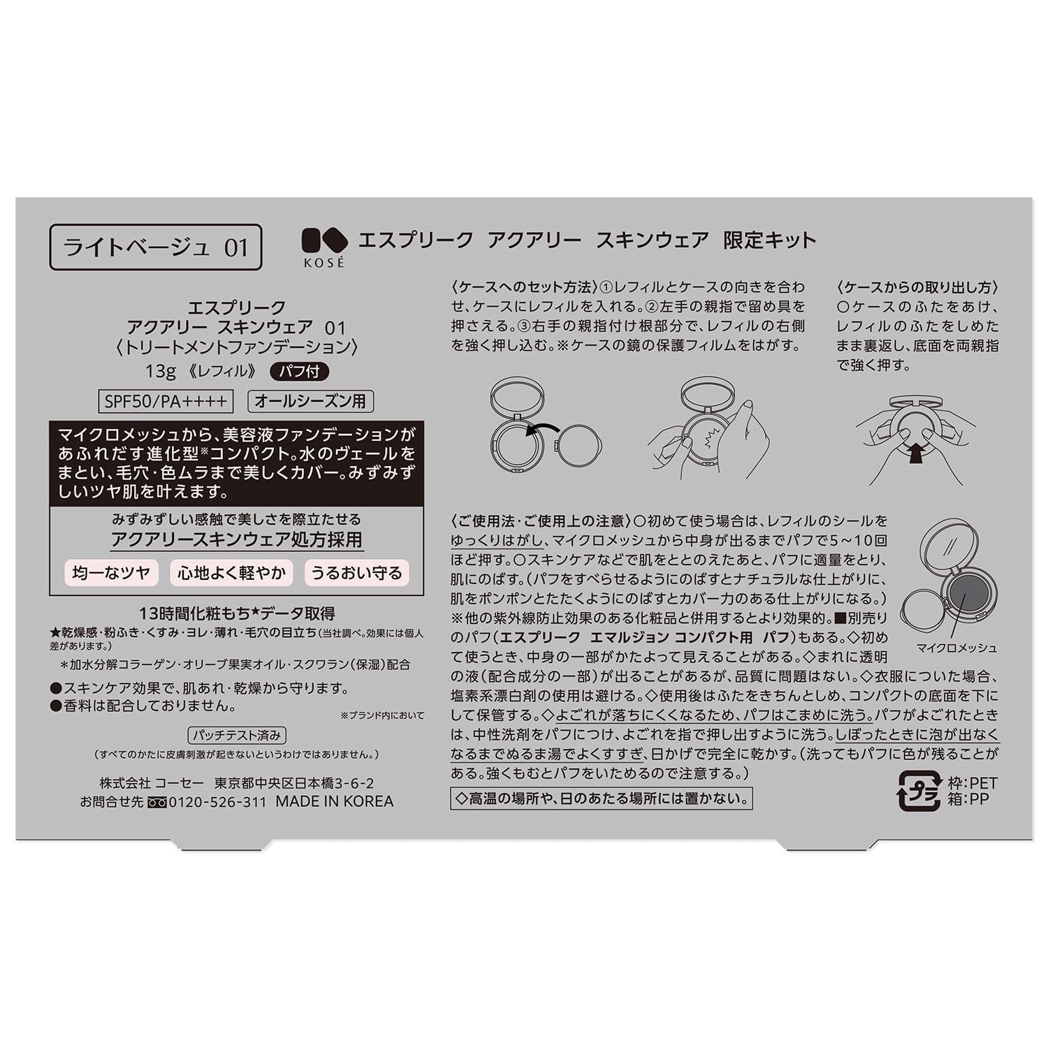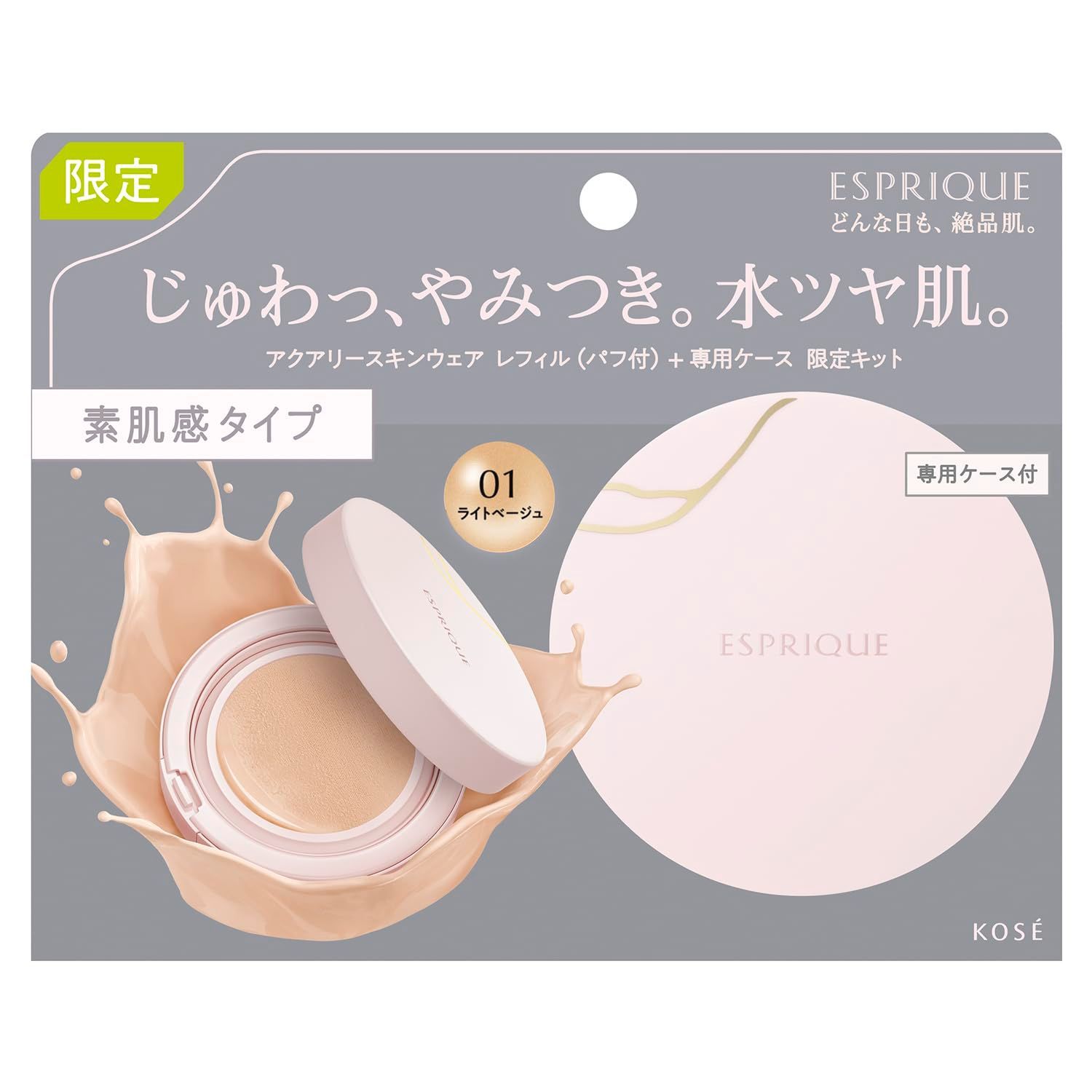 ESPRIQUE(エスプリーク) アクアリー スキンウェア 限定キット 01 ライトベージュ (レフィル+ケース+パフ) ファンデーション SPF50/PA++++ ツヤ肌 毛穴 カバー 美容液 保湿 裏ごしファンデ